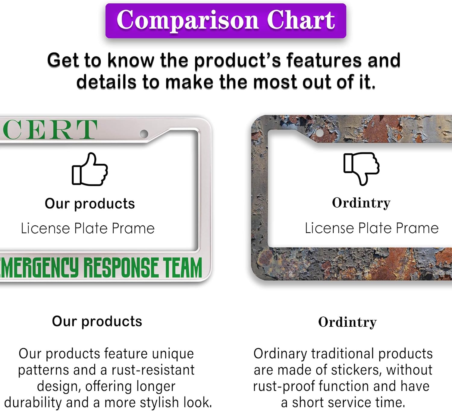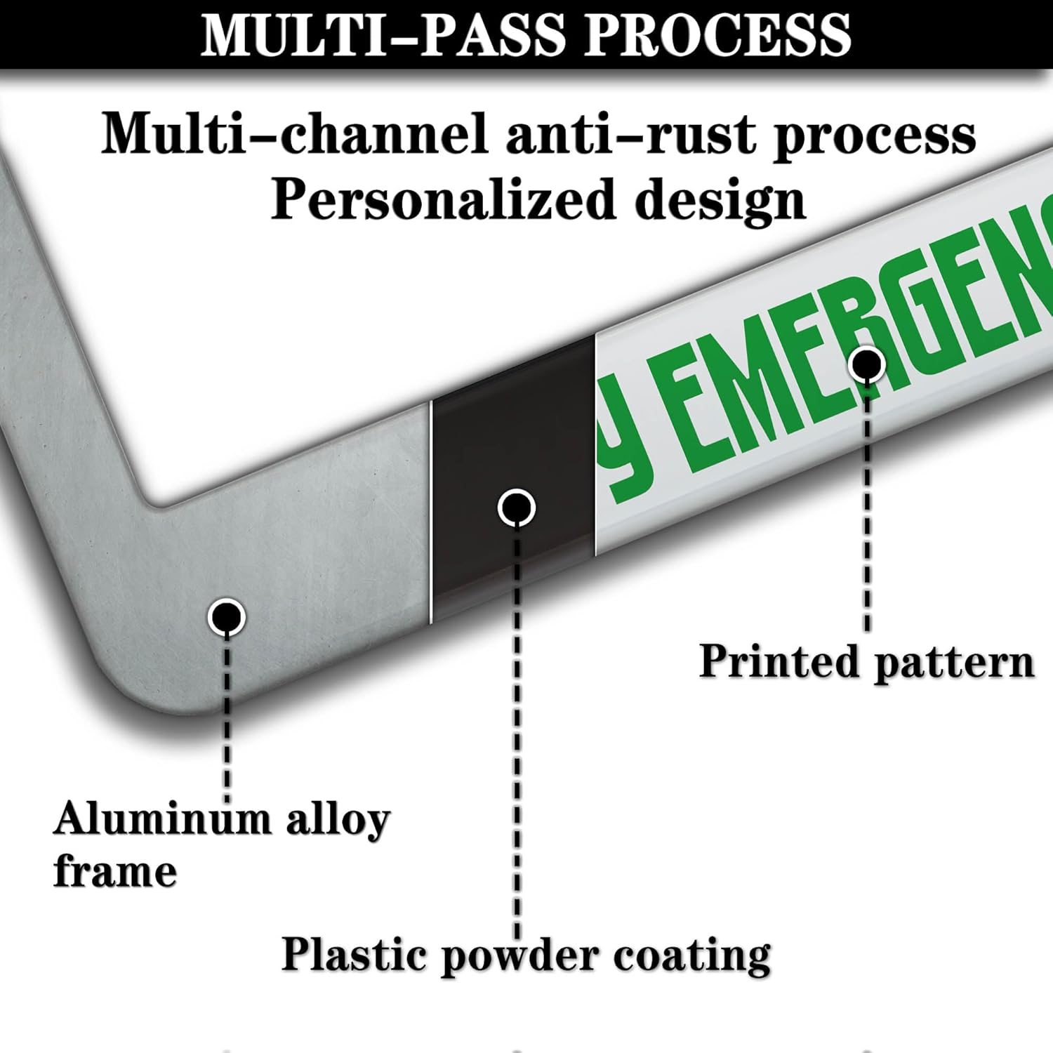 - ALUMINUM FRAME: This License Plate Frame is crafted from high-quality aluminum that is resistant to corrosion, rust, and harsh weather conditions. Its rugged reliability design ensures a long lifespan, making it capable of withstanding car washes and extreme weather, providing you with a reliable and stylish solution for your vehicle.