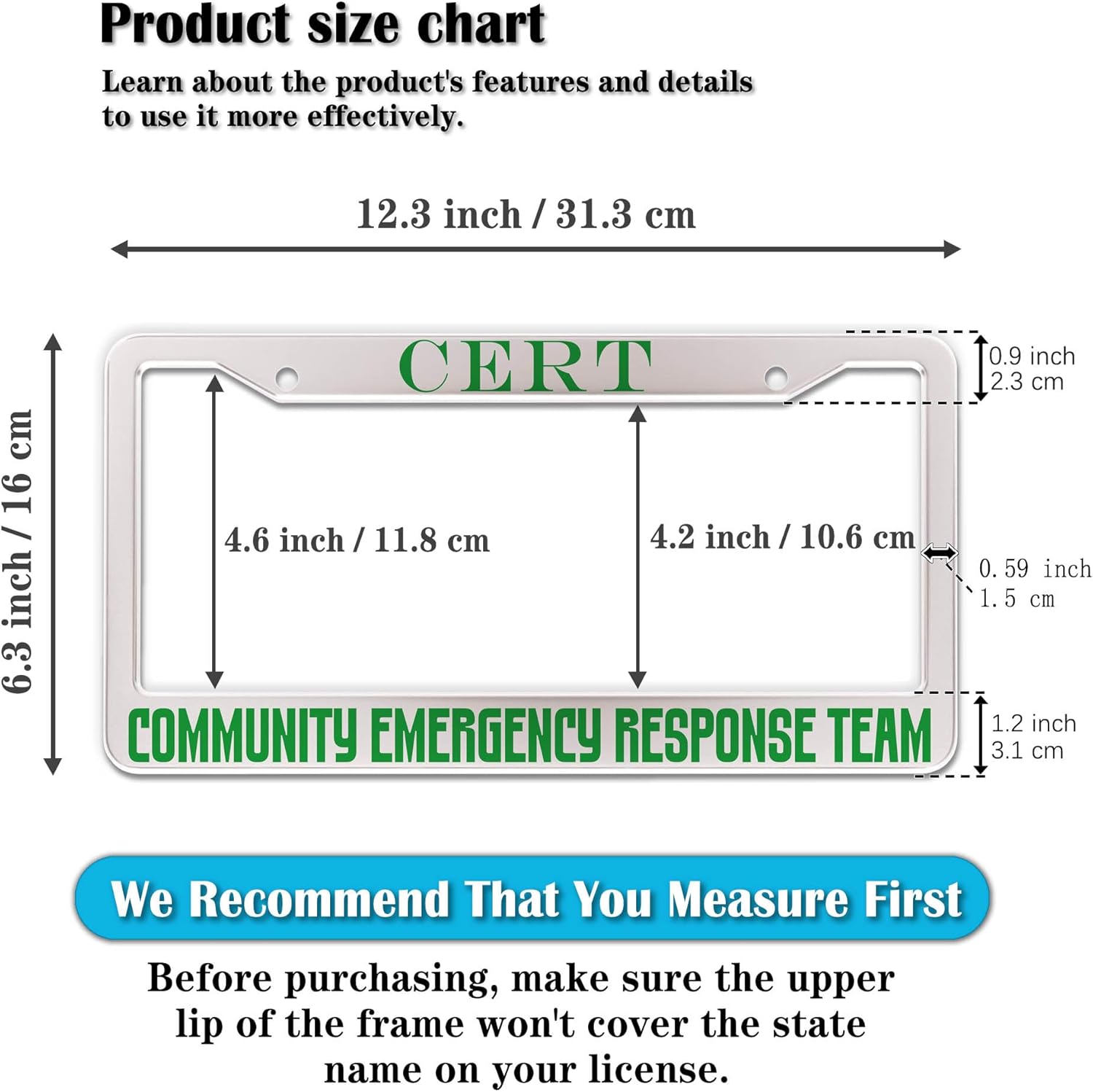 - STANDARD FRAME SIZE: Ensure a perfect fit by checking the dimensions to avoid covering your state name. These frames are specifically designed to fit standard American license plates measuring approximately 12.3" x 6.3" (16 x 31 cm). for most license plates in the U.S.
