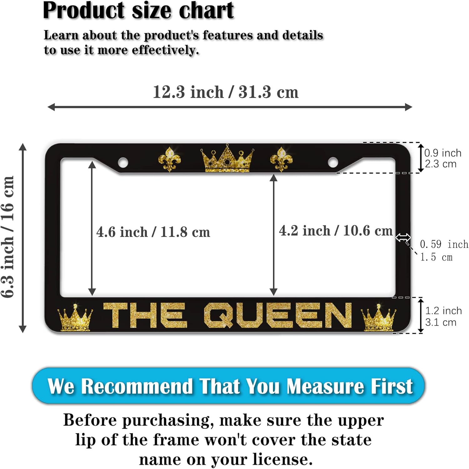 - STANDARD FRAME SIZE: Ensure a perfect fit by checking the dimensions to avoid covering your state name. These frames are specifically designed to fit standard American license plates measuring approximately 12.3" x 6.3" (16 x 31 cm). for most license plates in the U.S.