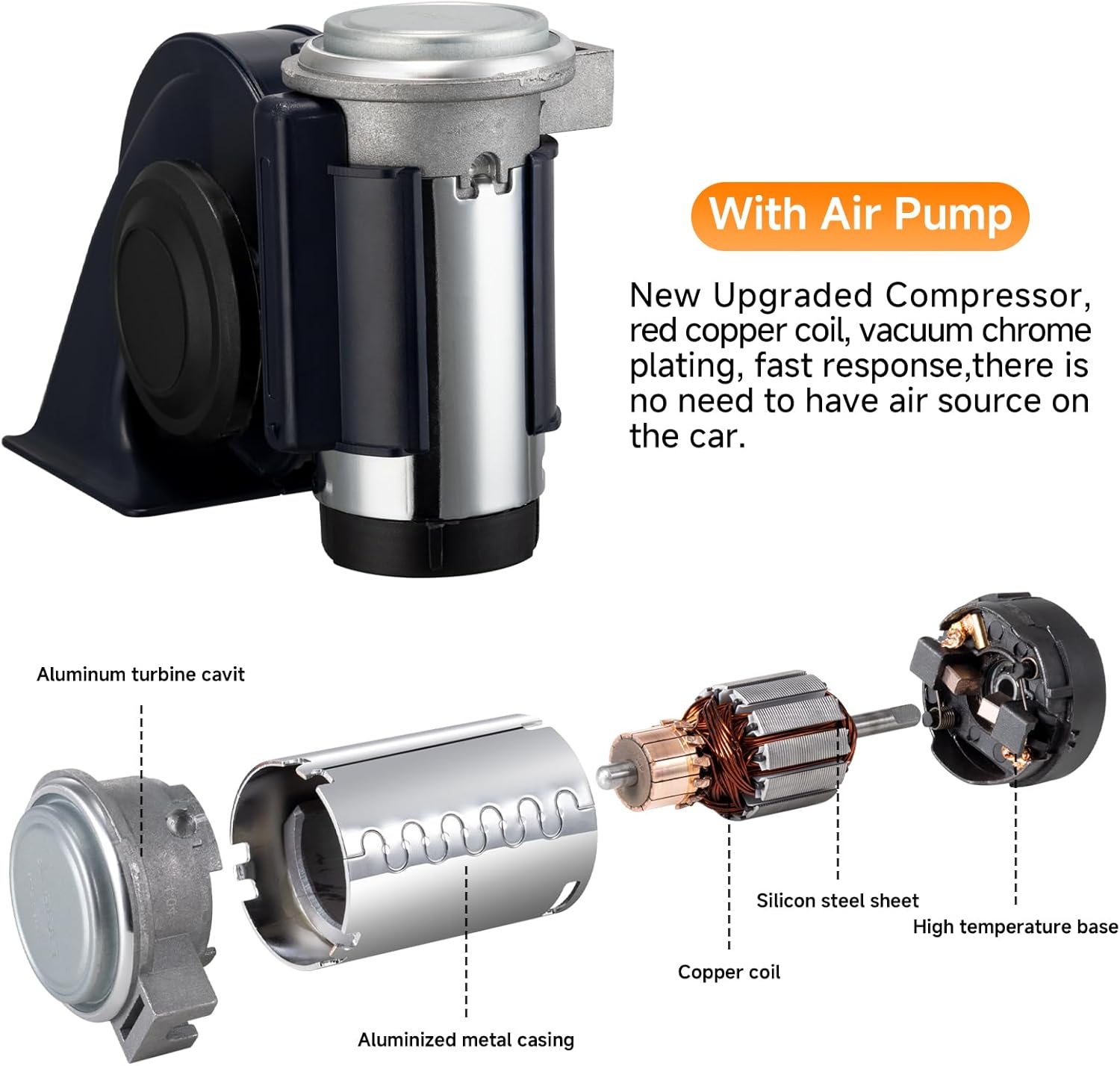 - 【Innovative Design】Our air horn features an extremely powerful directly injected mini-compressor paired with a snail design, up to 150DB ! The sound is harmonious, loud enough, and the sound quality is excellent. All integrated into one small but powerful device