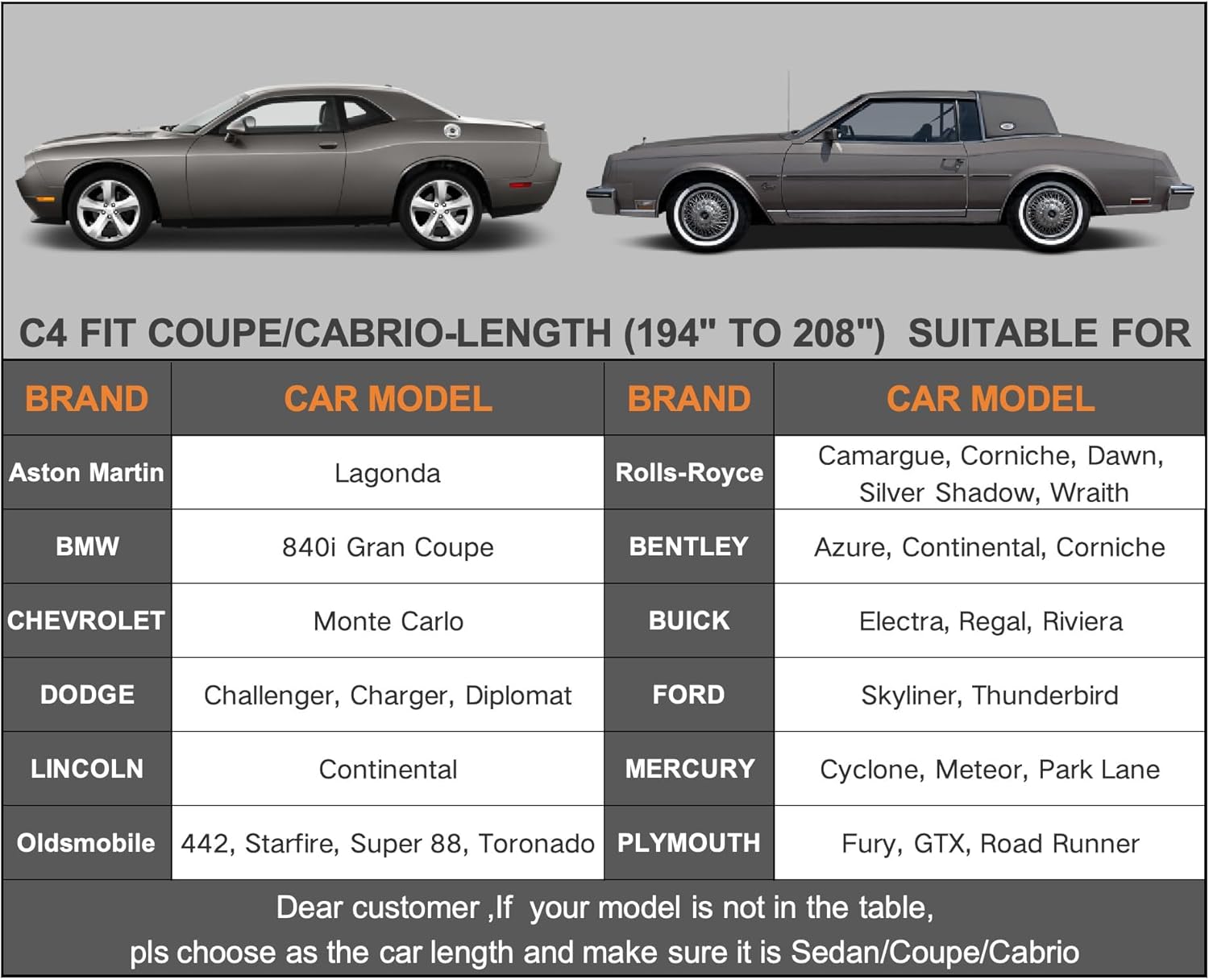 - 【Dimension C4】Universal fit for sedan/Coupe/Cabrio which length is 194-208 inch (Not for hatchback and SUV ). Suitable for Dodge Charger/Challenger, Chrysler Sebring etc.