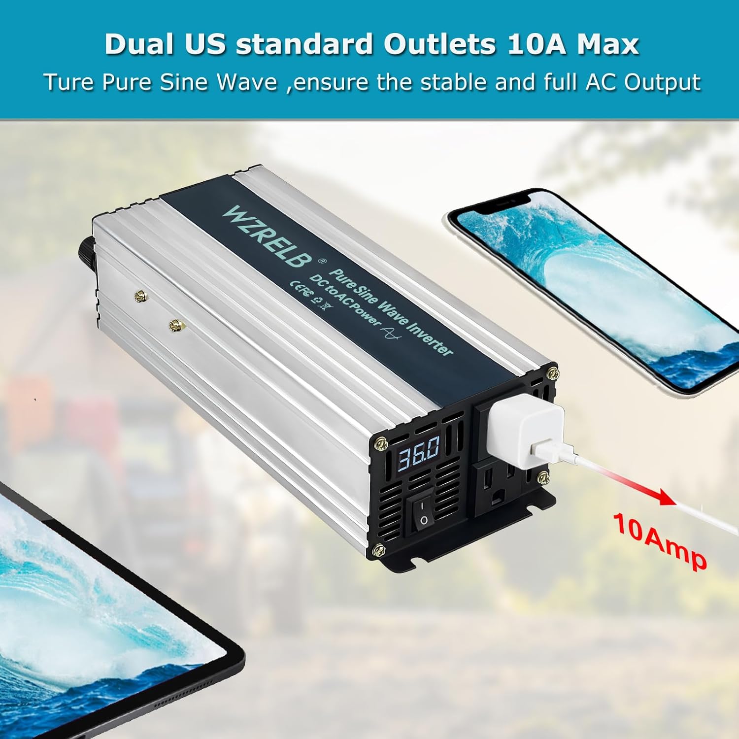 WZRELB 1200W Pure Sine Wave Inverter 36V DC to 110V 120V AC Power Converter with LED Display, Off-Grid Portable Power Inverter with 2 AC Outlets for Home, RV, Truck, Camping