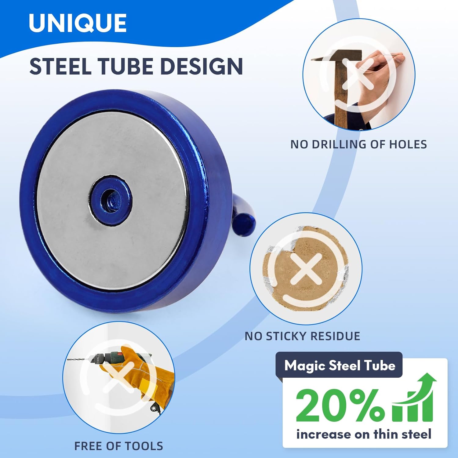 - ✔MAGIC STEEL TUBE DESIGN - Unique design of steel tube inside the base of magnetic hooks greatly increases the attractive force , especially on thin steel! It increase approximately 20% force comparing those none-tube magnets. it solves the problem of weak force on thin steel. Permanent magnetic hook with magic steel tube, strong magnetism lasts forever!