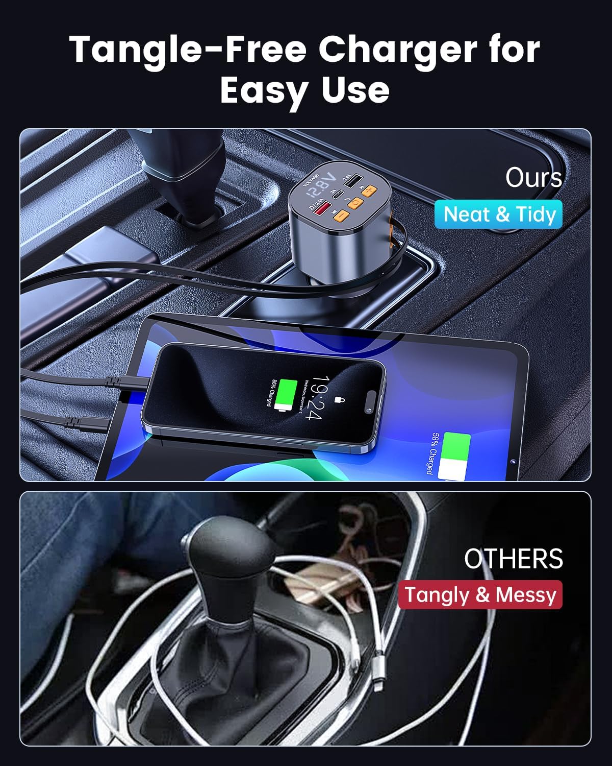 - 🚗【Wide Compatibility】Compatible with iPhones, Android phones, tablets, laptops, drones, and more. Works with all 12V-24V cars and trucks. Fast Charging Support: Compatible with PD, QC3.0, AFC, MTK, and FCP devices. Output Details: Lightning retractable cable: 5V/2.4A, Type-C port: 5V/3A, USB-A port: 5V/2.4A.