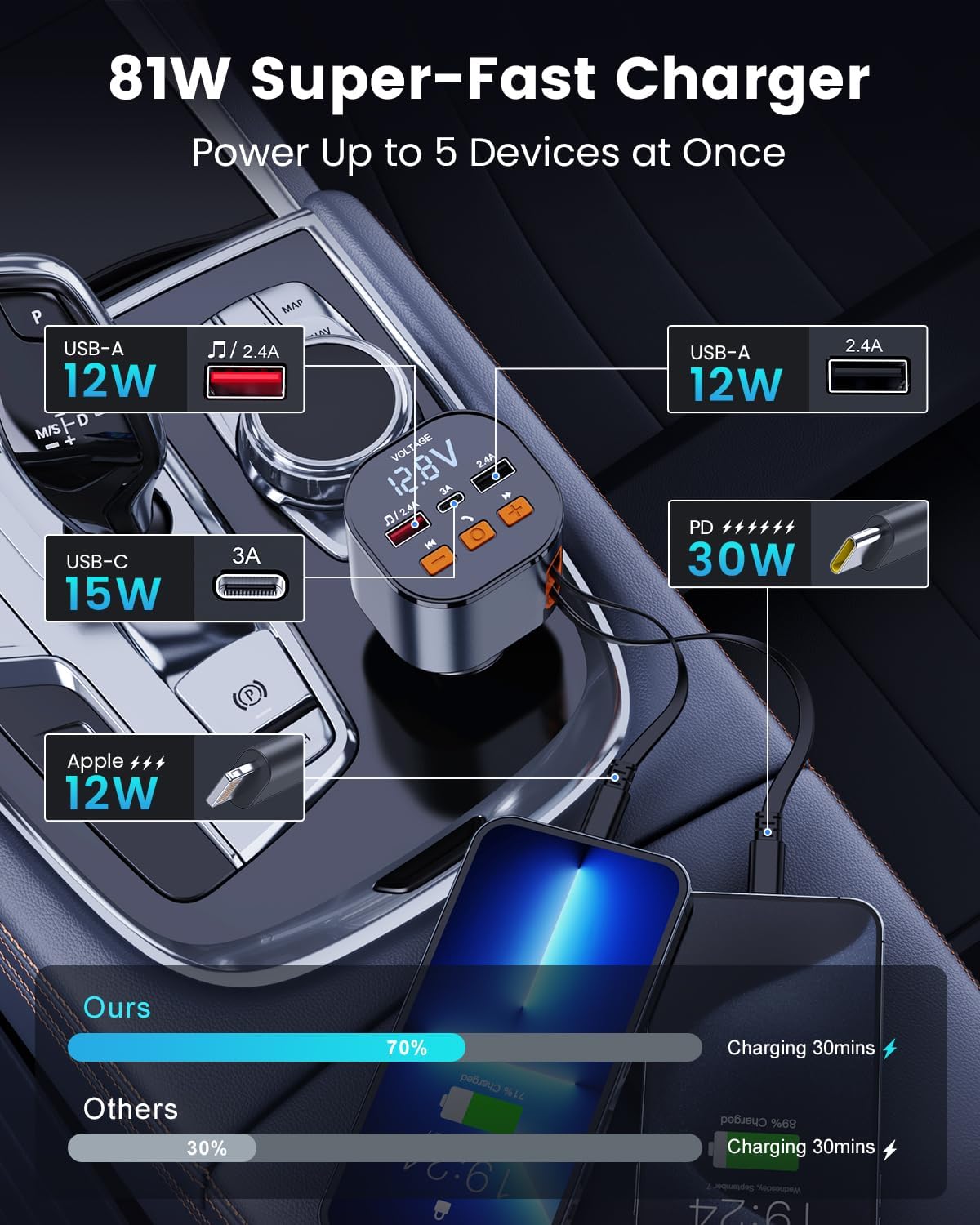 [2025 Upgraded] 81W Retractable PD Car Charger with Bluetooth 5.3, FM Transmitter, Hands-Free Calling, MP3 Player, USB & LED Display – USB-C Bluetooth Adapter for All Phones