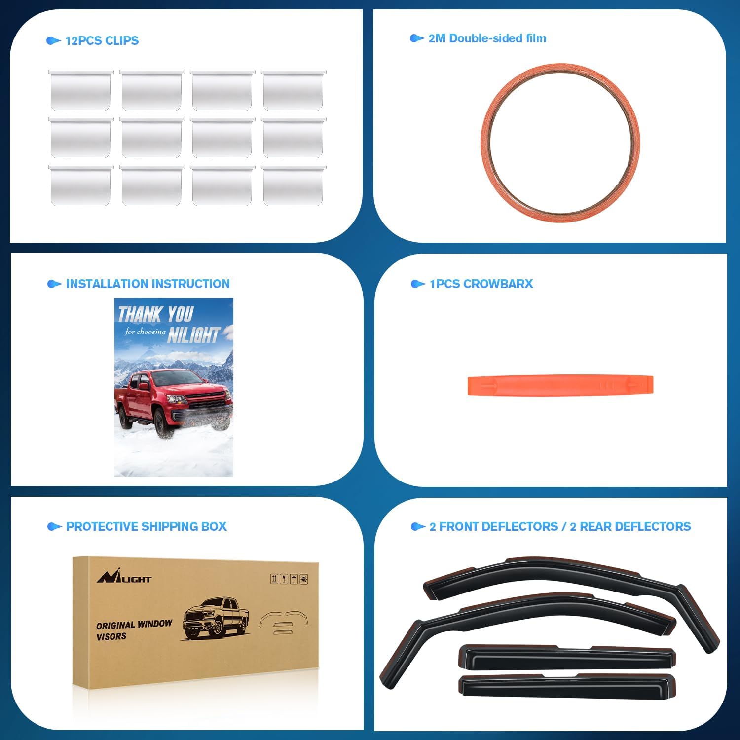 - Advantage:Nilight window deflectors are great for all weather conditions,help improve ventilation inside and outside your car to reduce mirror and window fogging while increasing air circulation。With our side window deflectors, it deflects the rain and noise away from your windows to make your driving more enjoyable