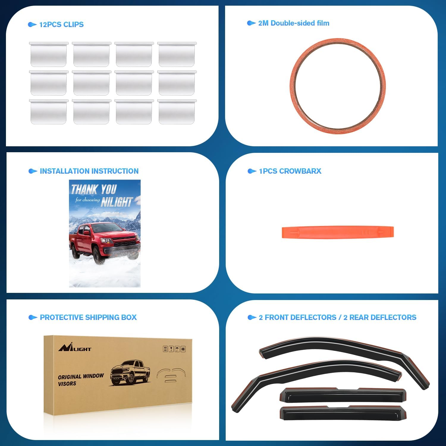 - PACKAGE INCLUDED:4 PCS Rain Guards,12pcs clips,Crowbar 1pcs,78inch double-sided tape and installation instruction