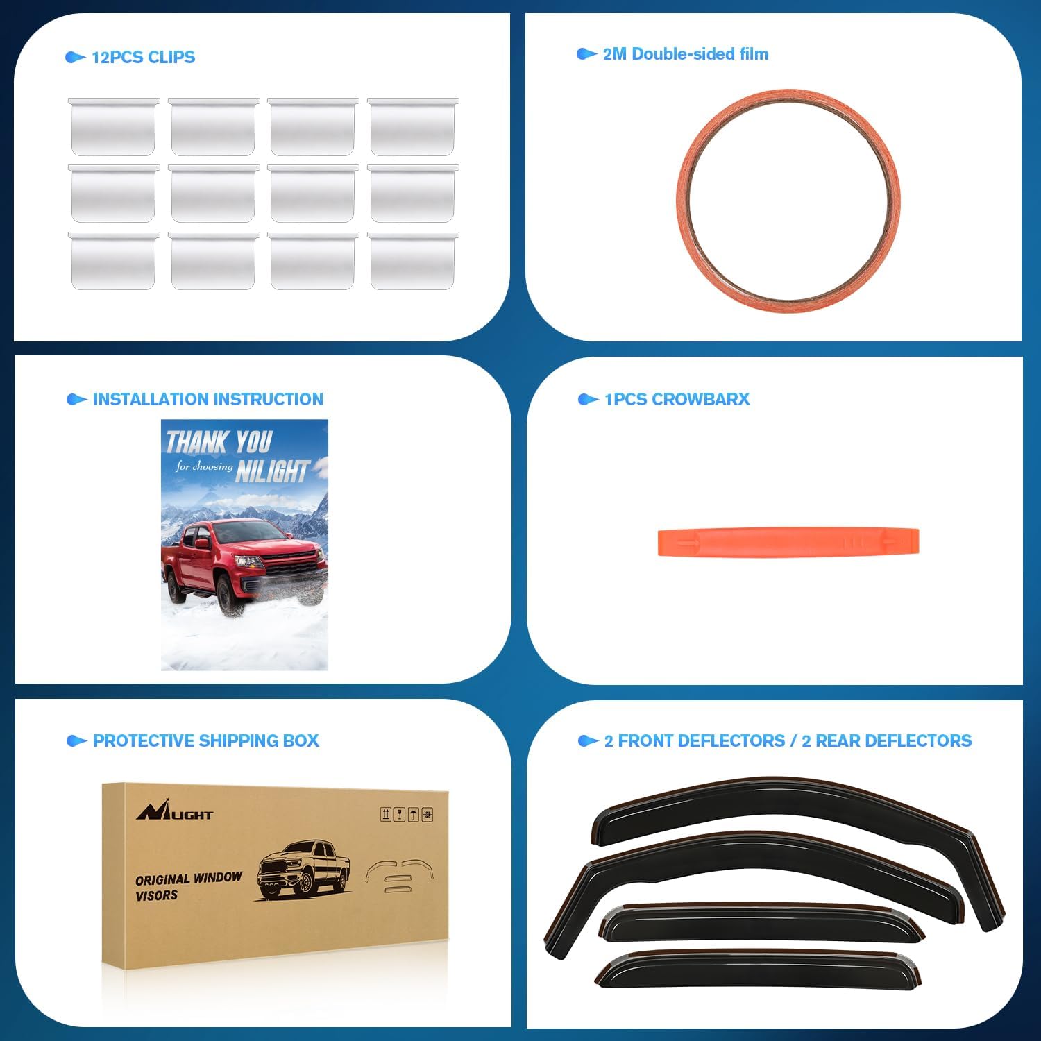 - Advantage:Nilight window deflectors are great for all weather conditions,help improve ventilation inside and outside your car to reduce mirror and window fogging while increasing air circulation。With our side window deflectors, it deflects the rain and noise away from your windows to make your driving more enjoyable