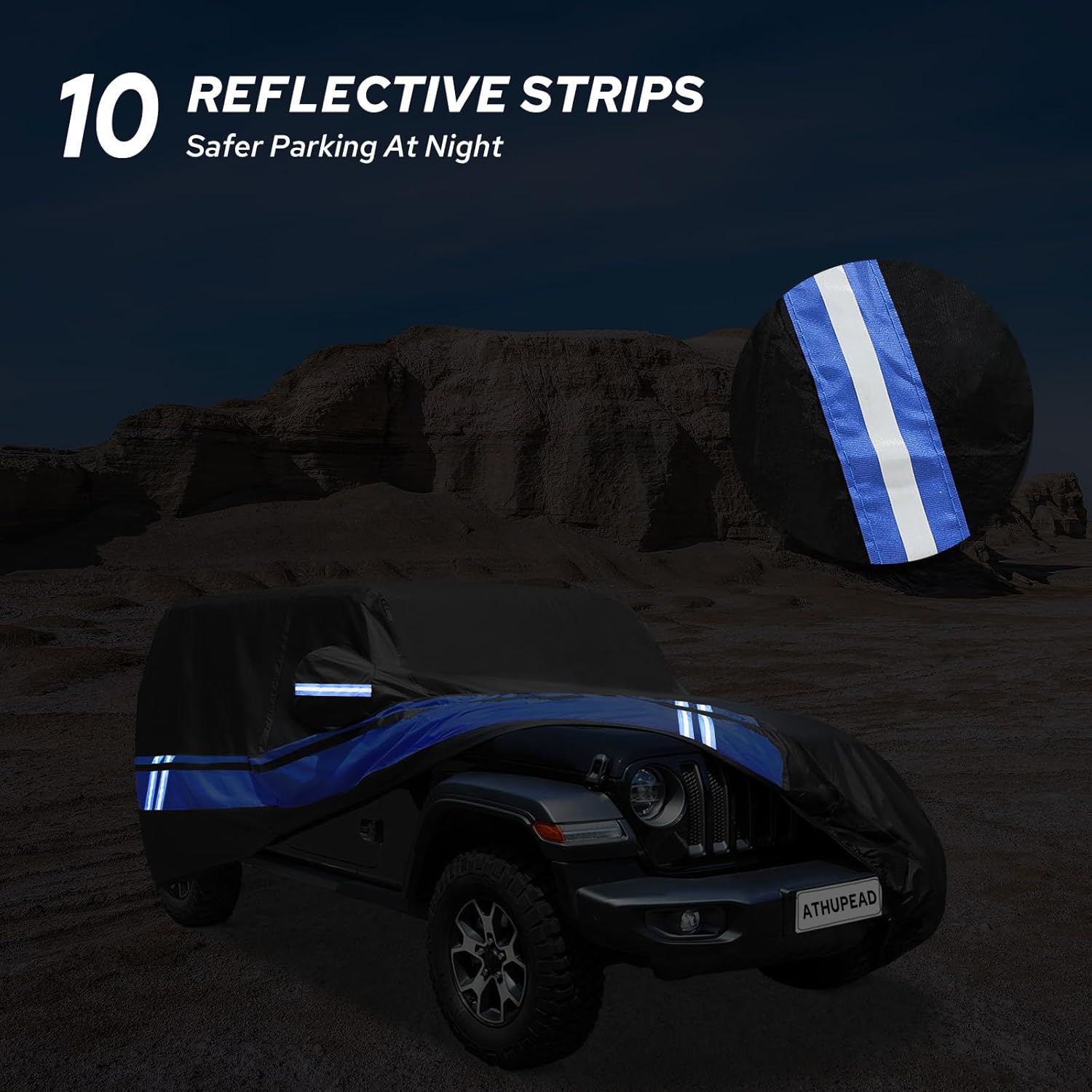 - 【Multifunctional Design】1.ATHUPEAD Jeep Waterproof 4 door has a door zipper on the driver's side. 2. Unique reflective strip design to remind others at night. 3. There are vents on the side of the car cover. 4. There is a front logo on the front of the car cover. 5. The car cover provides an antenna eyelet kit.