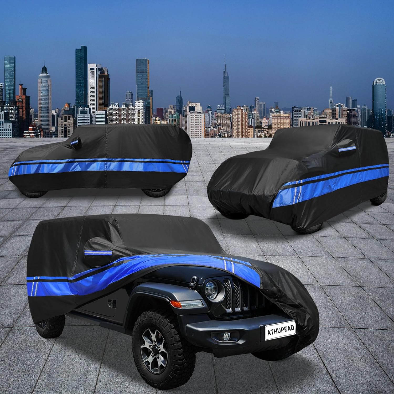 - 【All-Weather Protection】ATHUPEAD for Jeep Wrangler cover all-weather provides comprehensive protection for your vehicle. Whether it is bird droppings, pollen, and tree sap in spring, heavy rain, dust and ultraviolet rays in summer, fallen leaves, acid rain, small animals in autumn, blizzards, hail, and other extreme weather in winter. As long as you have ATHUPEAD all-weather car cover, you will say goodbye to those annoying things and enjoy the fun in different seasons.
