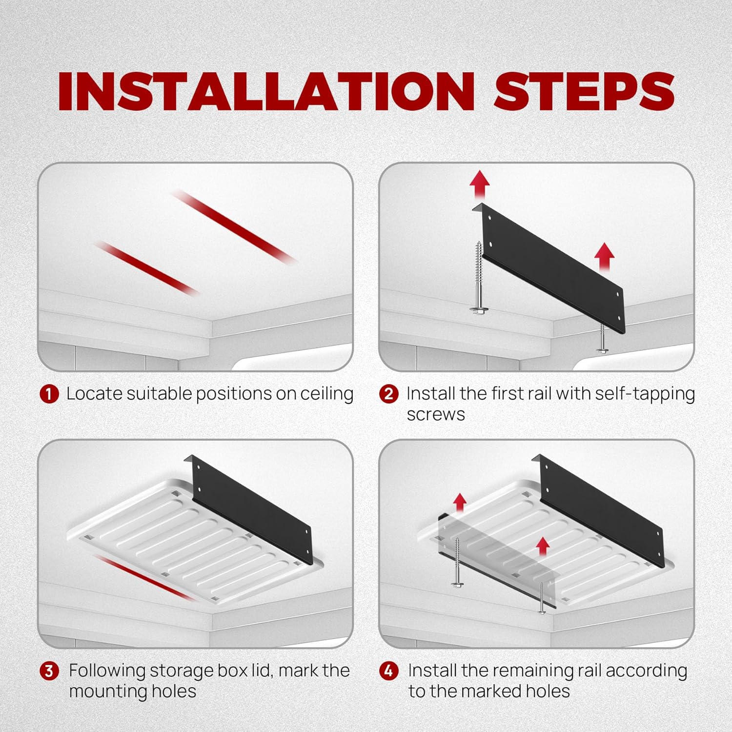 - [Widely Applicable] - Featuring a perfect size for compact storage and quick access, each 17-inch long rail of this garage ceiling storage rack can fit most of bins