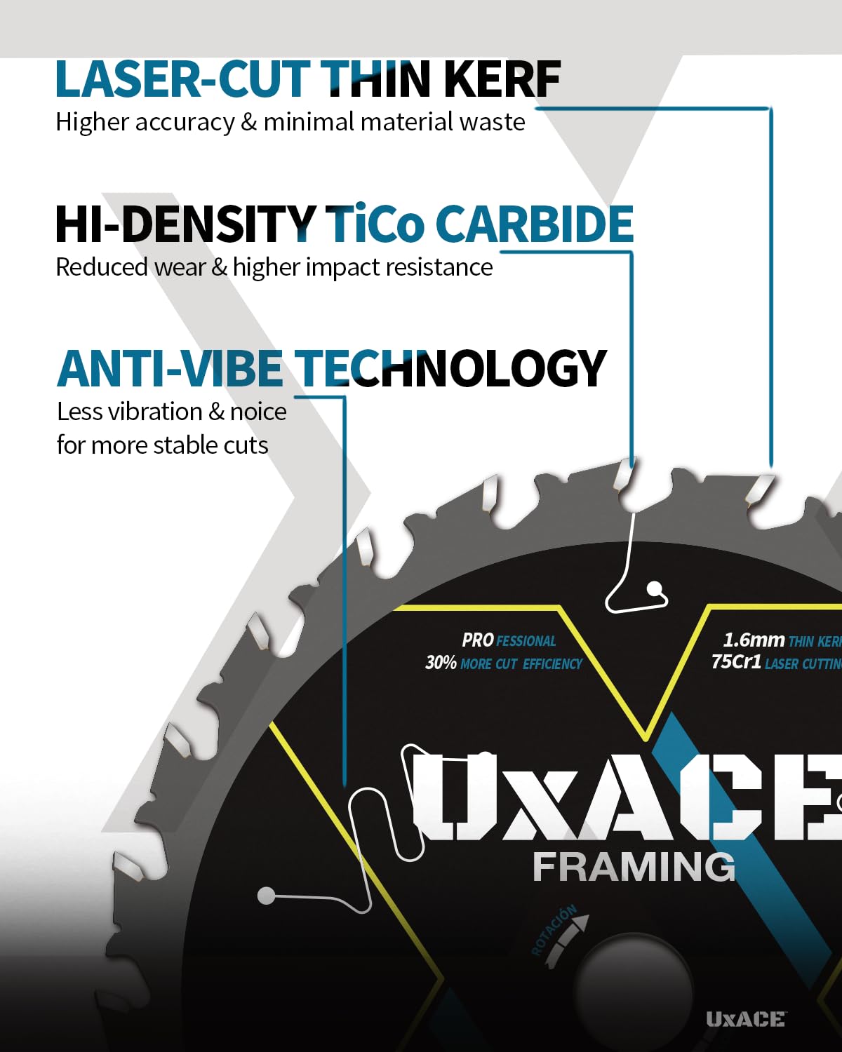 - 【WIDE RANGE OF APPLICATION】UXACE professional wood cutting circular saw blade delivers extraordinary performance and maximum lifespan. With thin kerf design, hi-density TiCo carbide and 75Cr1 hardened steel body manufactured, this is the blade suitable for anyone looking for smooth and clean cutting experience on softwood, hardwood, plywood, pressure treated wood, MDF, OSB, lumber and laminated using a corded or cordless circular saw