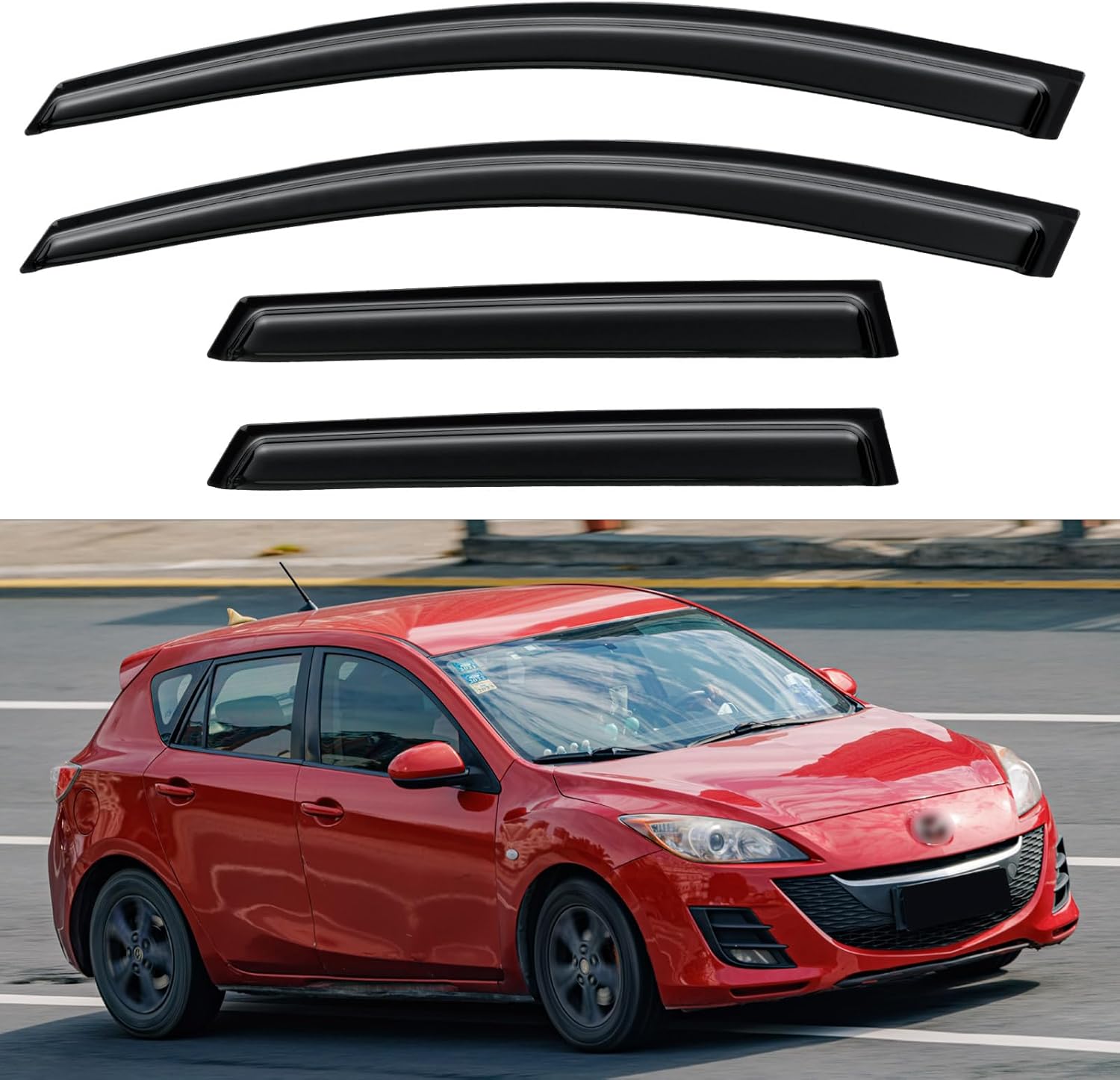 - 【Perfect Fit】YQAUTEC 4Pcs Out-Channel/Outside Adhensive Window Visors Rain Guards Shield fit for 2010 2011 2012 2013 10 11 12 13 Mazda 3 Hatchback, Side Window Vent Wind Deflectors Visors Shades. (NOT for Mazda 3 Sedan)
