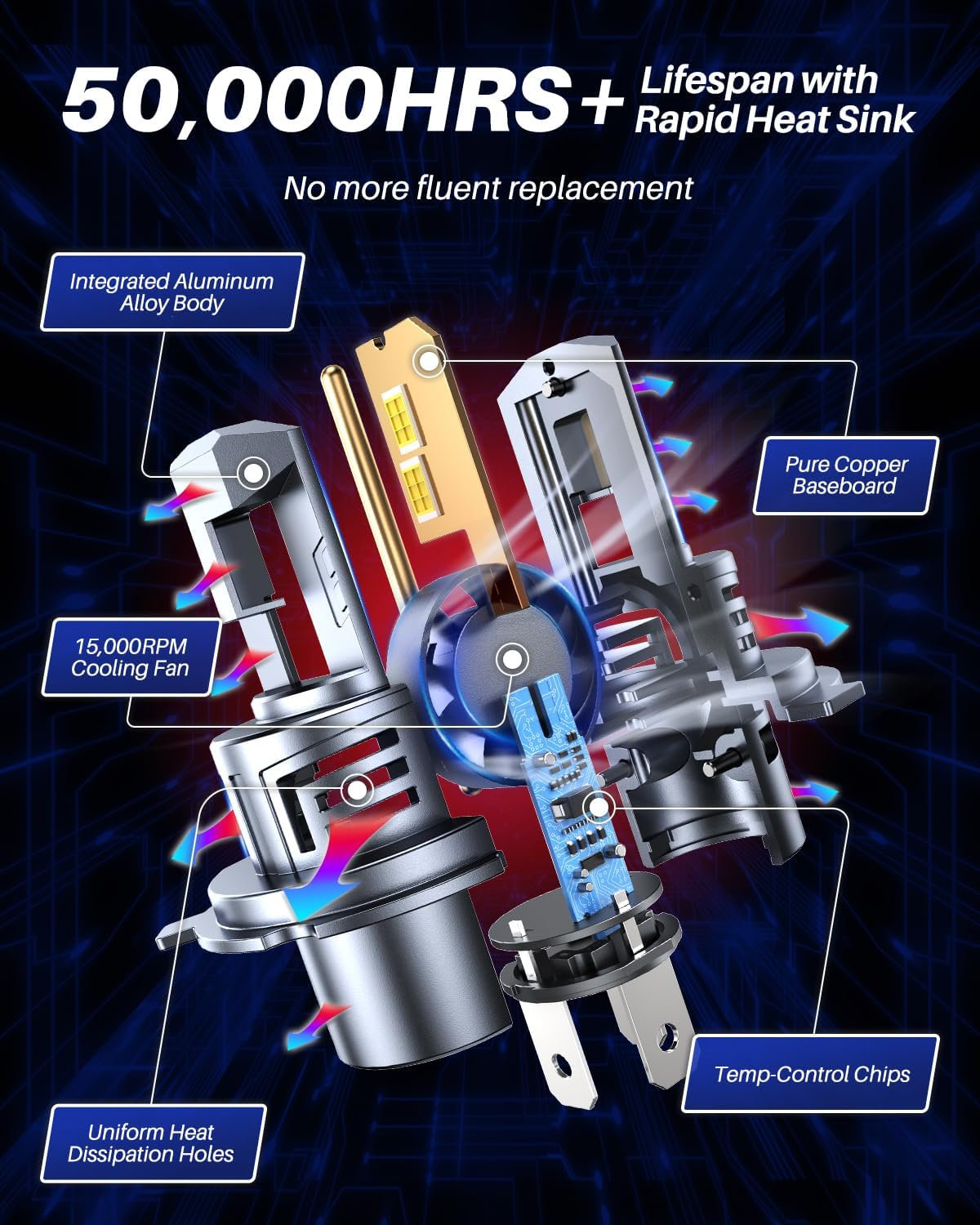 - Stable Performance and Longer Lifespan: Built-in 15,000RPM high-speed silent cooling fan. Combined with copper base and unique hollow design on all-in-one aluminum body. Which help to dissipate the heat generated from the LED chips rapidly and effectively. Ensure the 9003 light bulb work steadily and continuously up to 50,000 hours