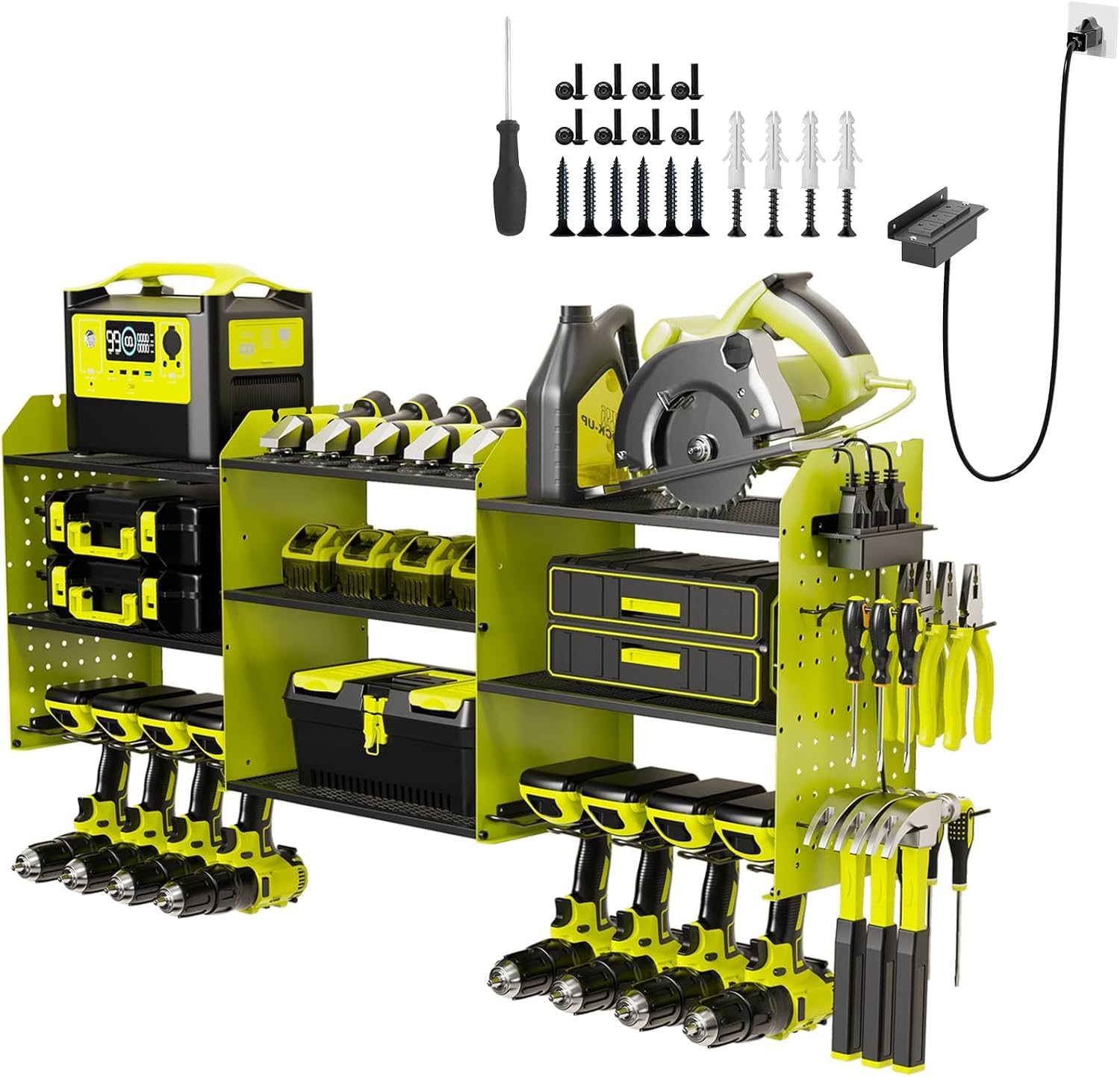 - 【EASY TO INSTALL & PERFECT ACCESSORIES】The installation process of ourpower tool organizer wall mount is very simple, just use screws to connect the specification steel wire and plating, and then hang it on the wall. Package components include: 1.97 inches 20 screws; 0.31 inches 6 bolts; 1 screwdriver; 0.39 inches 40 bolts; 4 hooks; 1 plug