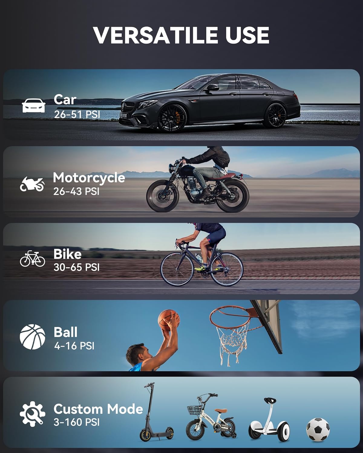 - 【Multi-Device Compatibility】Versatile nozzles fit cars, trucks, motorcycles (tire air pump), bicycles (air pump for bike tires) and sports gear. 2-year warranty, and 24/7 US-based support.