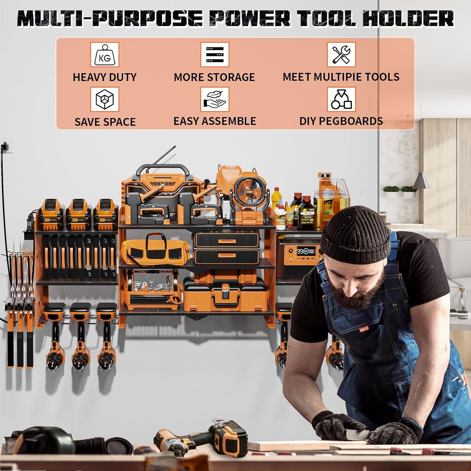 - 【HIGHLIGHT DESIGN】Our power tool organizer wall mount has a user-friendly 3-plug and plug-in row with 3 jacks that can be mounted on either side of the shelf. With an output power of 125V/12A/1500W, it delivers reliable power to your equipment. It also includes a 6.56-ft power cord for extra convenience.