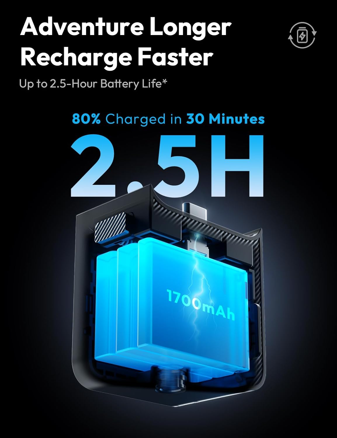 - Dual Screen Ation Camera: When connected to the battery, this is a dual-screen 4K action camera. You can switch the screens by long pressing the first button on the left side of the screen (with the lit screen as a reference). When you take a selfie, you can find a better angle to shoot and record the most beautiful moments.The battery life can support continuous shooting of 4K 30FPS video for 2 hours, ensuring that more wonderful moments can be recorded