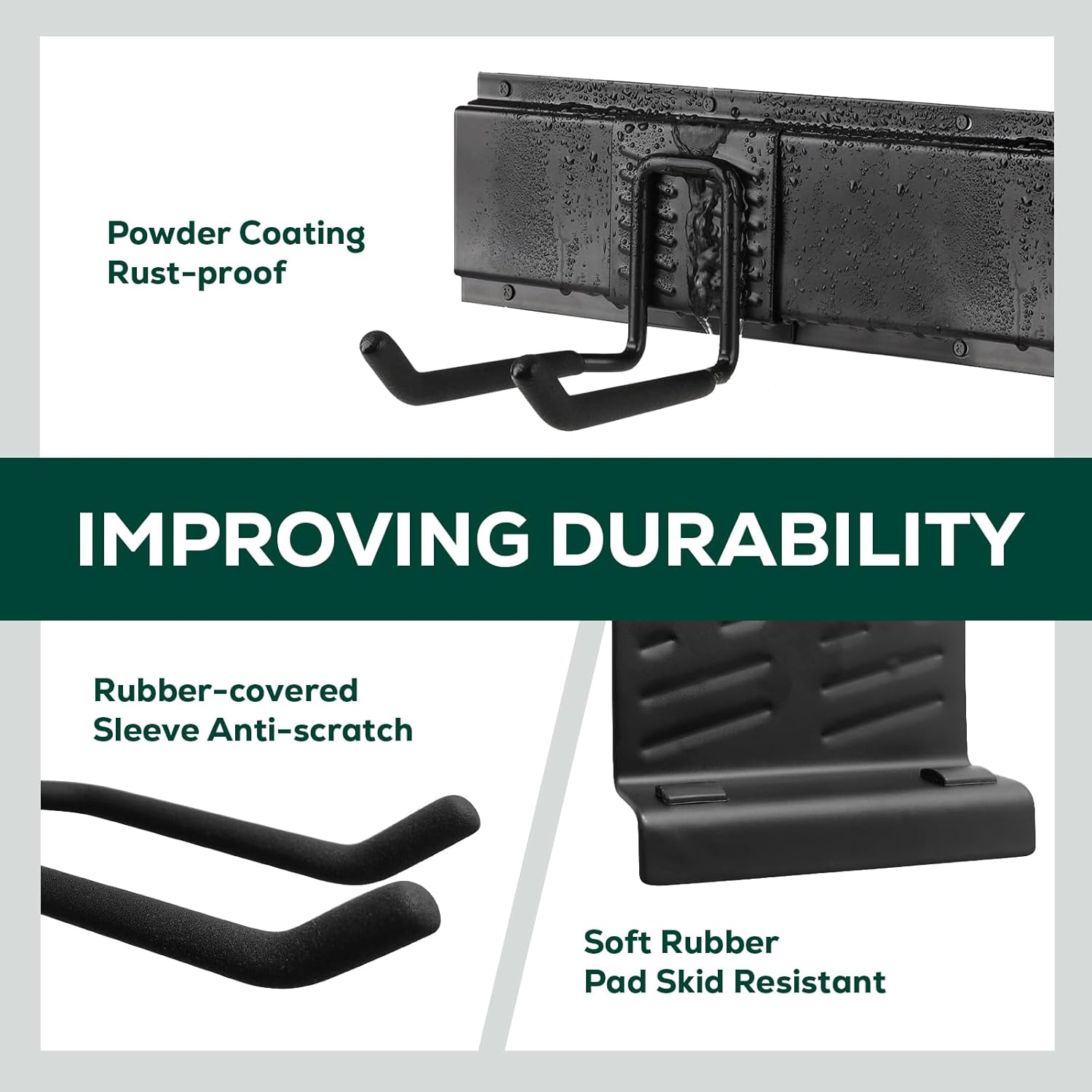 - 【Heavy Duty & Durable& Max 440lb】Our wall-mounted garden tool storage rack is made from sturdy high-strength steel, providing reliable organization for your garage. The powder-coated surface enhances durability and can withstand everyday wear and tear.