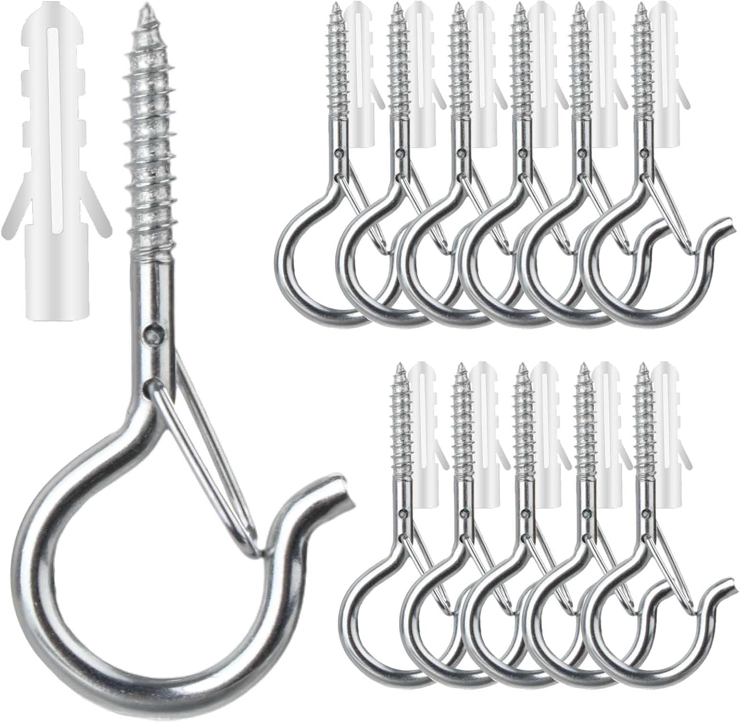 12 PCS Q-Hanger Hooks, Screw Hooks for Outdoor String Lights, Safety Buckle Design Cup Eye Hook for Hanging Christmas Lights, Plants, Wind Chimes, Mounted on Wall Ceiling, Windproof, Silver