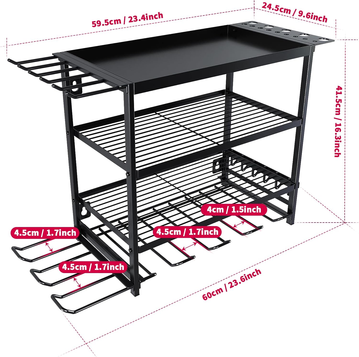 - Wall mount power tools organizer come with 4 slots, 4+2 hooks and drill bit rack, The bottom layer can store 4+2 cordless drills, the upper three layers can store other heavy tools or various small tools, and a hammer holder, pliers holder and screwdriver holder are added to the side. The tools in the picture are for demonstration purposes only and are not included.