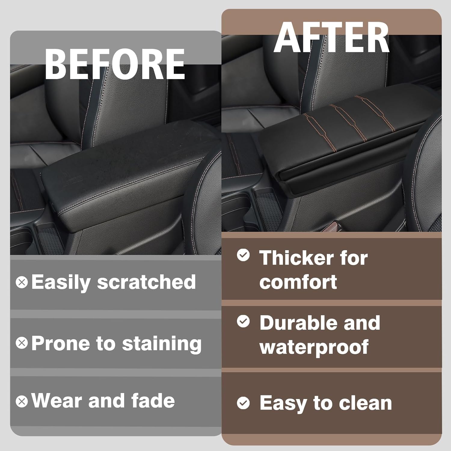 - Unique Design: Designed according to the OEM seat texturFunction: Not only makes your arms and elbows feel comfortable while long time driving, but also provides comprehensive protection for your center console to prevent pet paws, dirt, and sticky fingers. Highly recommend if you are looking for small mods or easy-install Honda CRV accessories.e to make it match your interior perfectly and even better. Our armrest cover is crafted with high-quality Vegan Leather and an extra layer of foam, which is skin-friendly, breathable and soft.