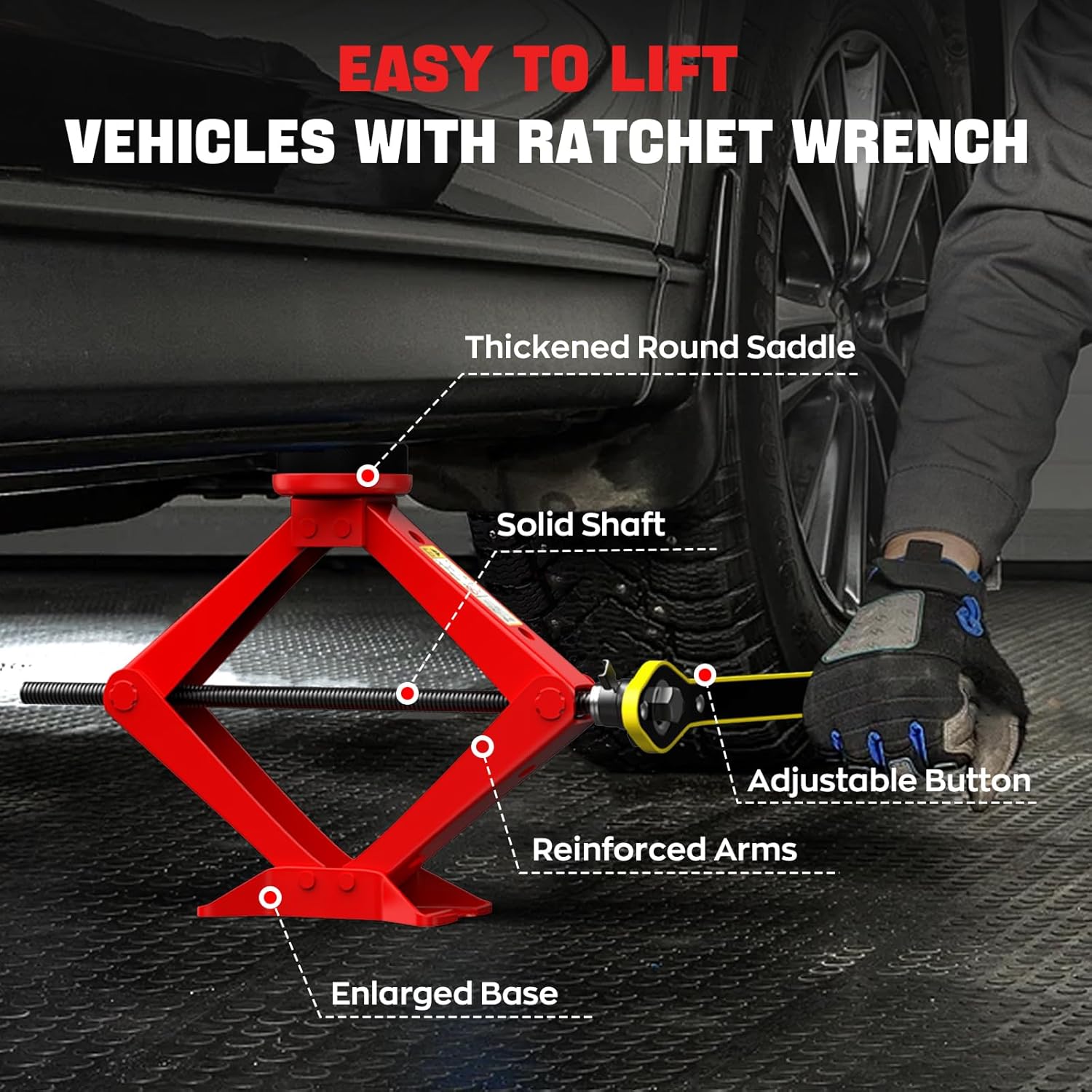 - 【Easy to Operate】The scissor jack has a simple and easy-to-operate design, while the lug wrench and tire changing kit are designed to provide a comfortable grip and maximum leverage.this car jack kit is a must-have for any roadside emergency tire change.