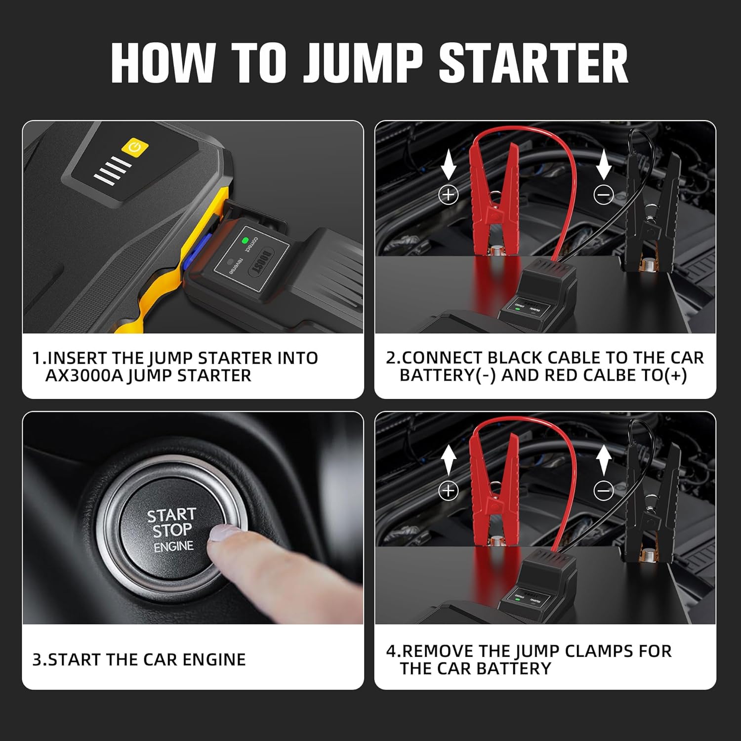 - 【WHAT WILL YOU GET】Asperx 3000A car jumper starter portable x1,smart jumper clip x1,data cable x1,storage box x1,user manual for jump starte x1.If you have any questions about the jump starter battery pack, please feel free to contact us