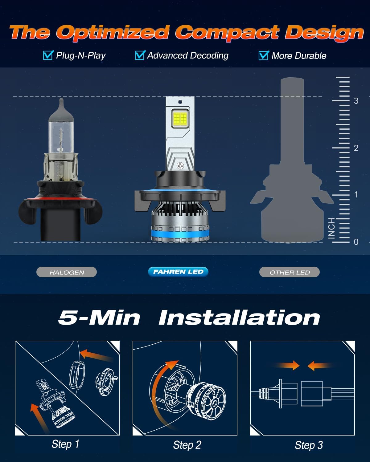 - Quick & Easy Installation in 10 Minutes: These H13 9008 bulbs are designed for a seamless plug-and-play installation, closely mimicking the fit of factory bulbs. Equipped with a decoder, installation is fast and hassle-free, taking just 10 minutes.