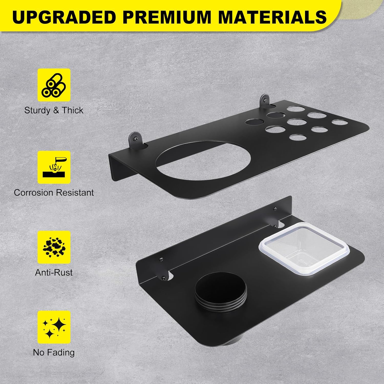 - Comprehensive Package: Each package includes a robust high-density carbon steel holder, divided into upper and lower sections for organizing funnels and accessories efficiently. Additionally, it features two removable plastic drip cups (square and round) and a complete set of 8 screws for secure wall mounting, ensuring immediate installation readiness