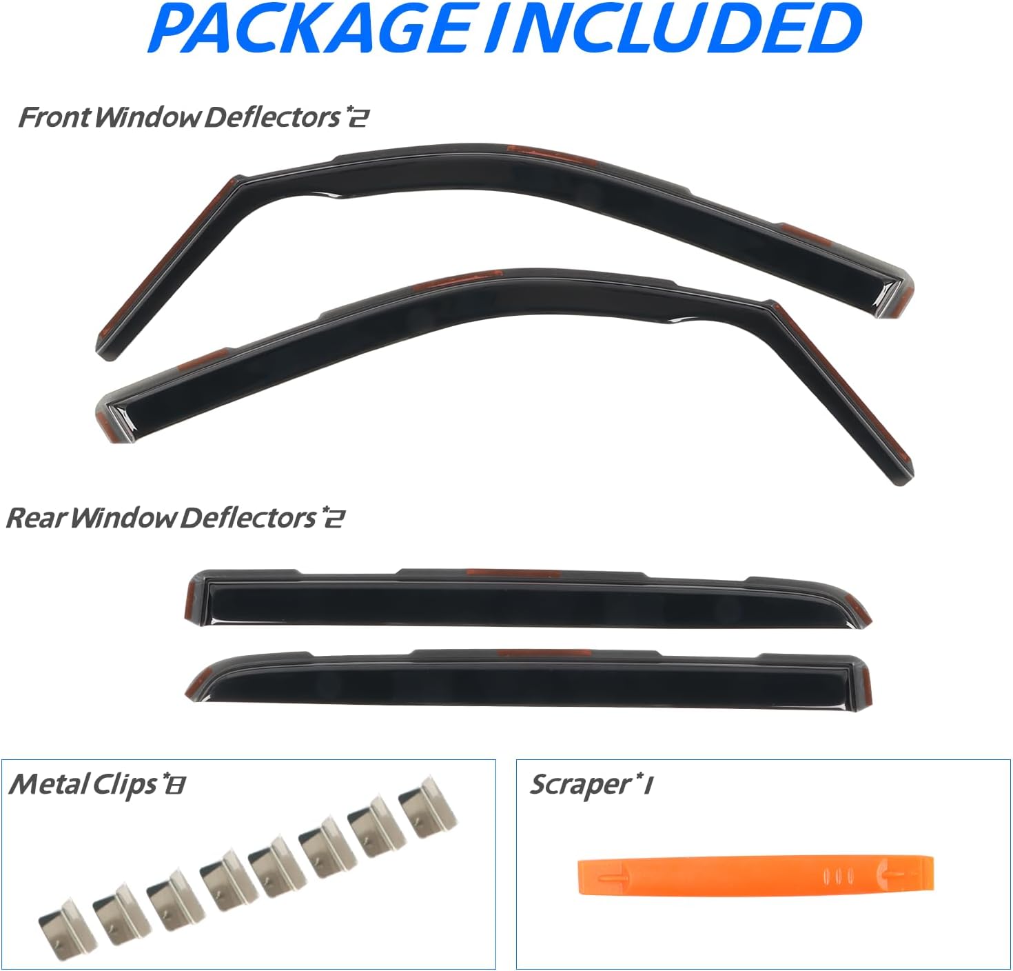 - ăEasy Installationă Come with 4 pcs FULL-SIZE side window deflectors, 8 pcs clips, 1 pcs plastic Crowbar for a durable and secure installation. No complicated instructions are needed. Attention: Please apply the clip to fix the rain guards