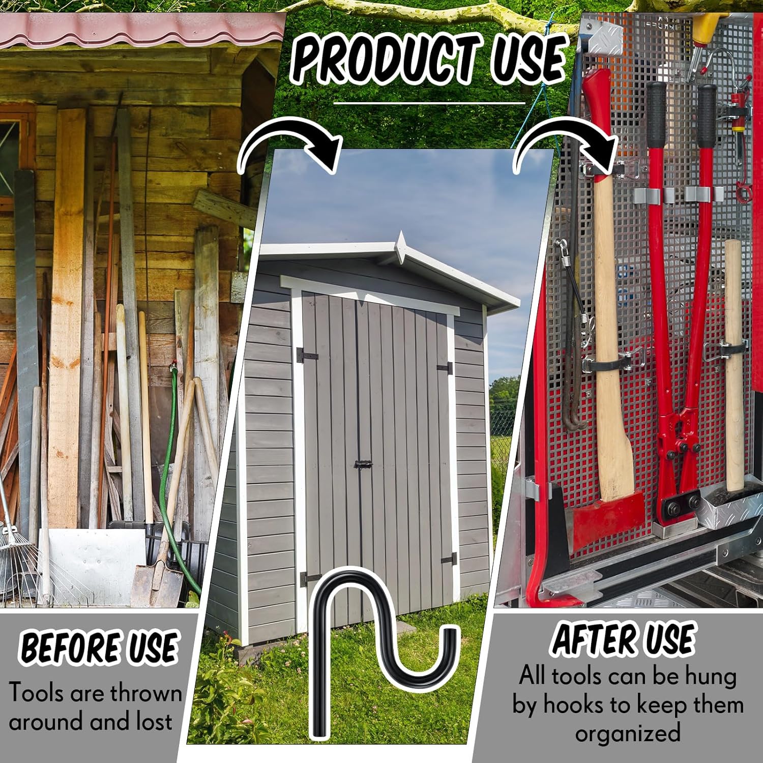 - Universal Design: enjoy a functional and universal design that makes these wall mount hooks an essential for most sheds; By arranging these hooks on your shed walls, you can maximize the utilization of your shed, enhancing its capacity to hold a multitude of tools or goods in an orderly manner