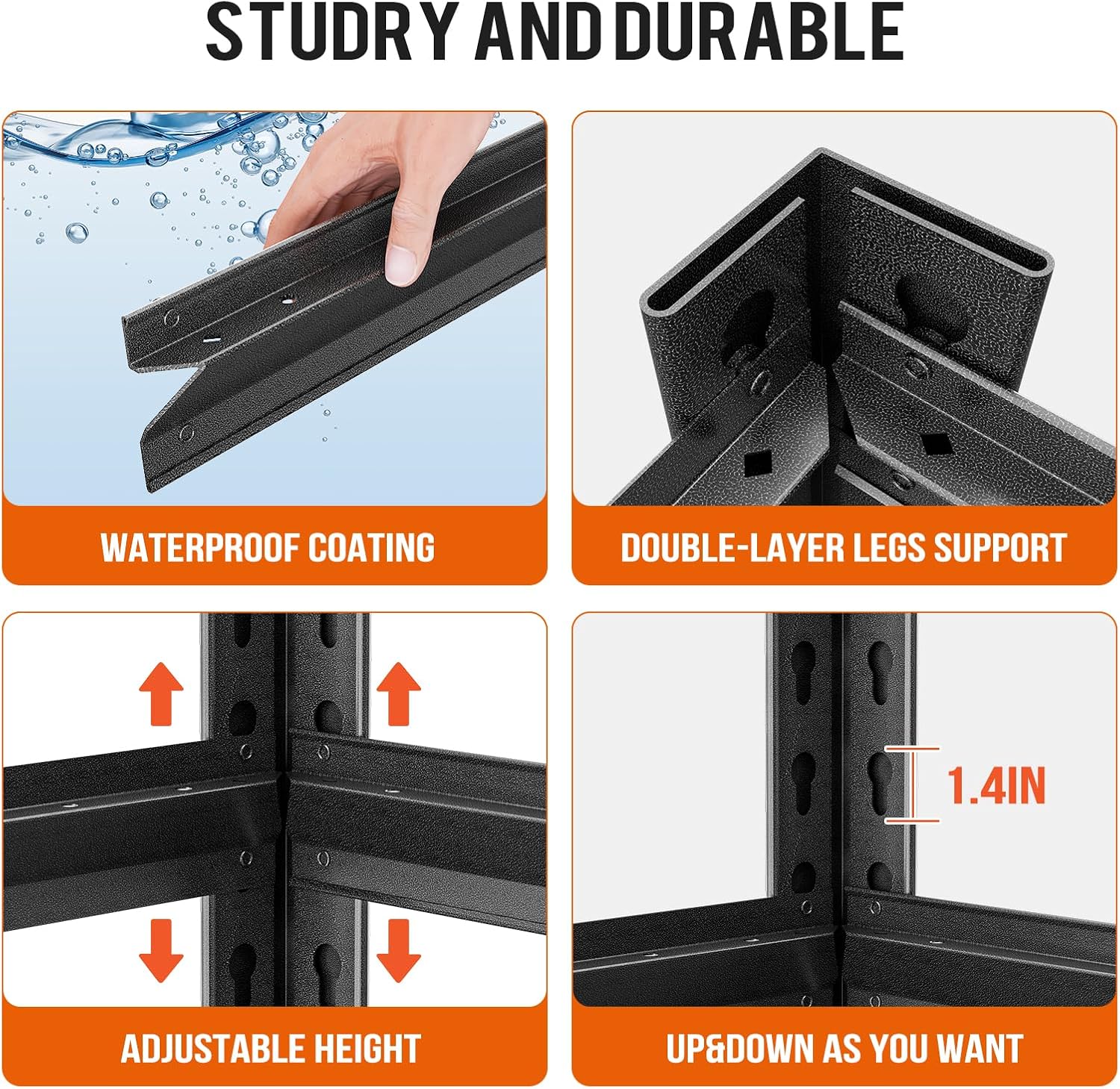 - 【2800LBS Garage Storage Shelves Heavy Duty】:Thickened metal shelving are made of quality metal material, covered with rust-proof powder coating, anti-scratch, rust-resistant, durable and easy to clean. Each level has sturdy support rib and can hold up to 560lbs. Garage shelf's total max load weight is 2800lbs. Double thickened metal legs are designed to provide excellent support. This rack shelf is more stable and sturdy than regular metal shelf for long-term use