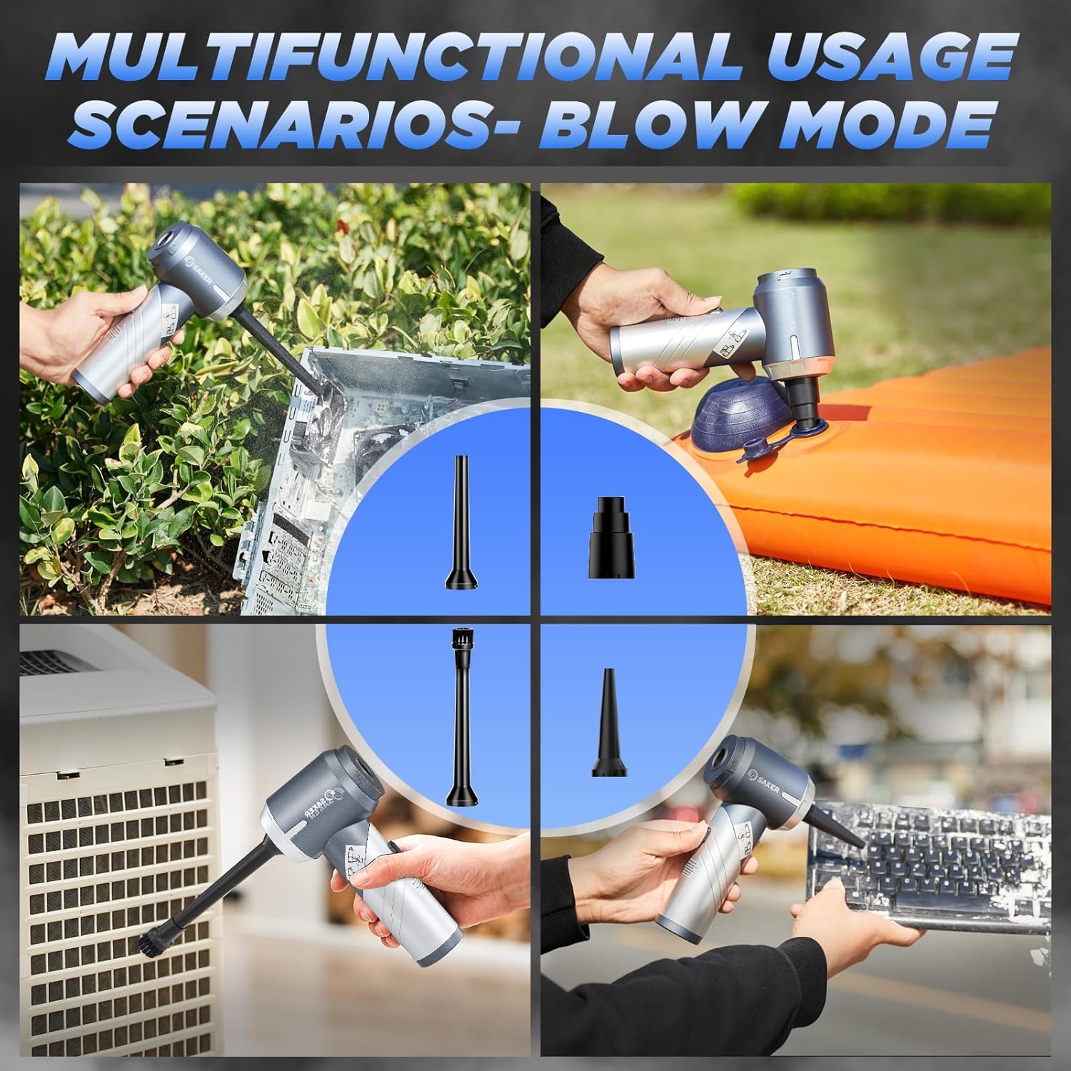 - 【3-In-1 Multifunctional Design】Saker mini vacuum cleaner is equipped with multiple accessories and can be used for various scenarios such as inflation, soot blowing, dust removal,let us enjoying the convenience of a multifunctional device. You can use this handheld vacuum cordless to clean difficult cleaning crevices such as cabinet corners, drawers, computer keyboards, and mainframes, as well as inflate lifebuoys or air mattresses.