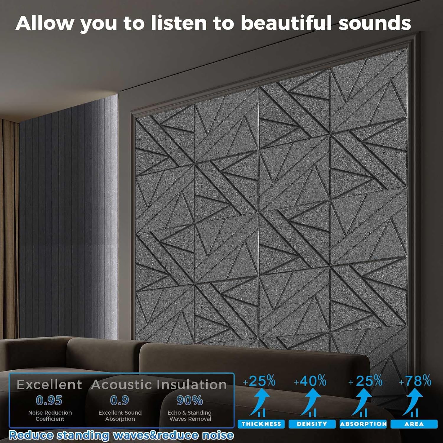 - 【Perfect DIY】: Soundproof wall panels with modern design concepts provide your space with unique decorative charm. Adopting a beautiful design with 45° chamfers, the wall noise blocker with this unique design pattern can be freely spliced and placed. You can assemble it into any DIY shape according to your decoration needs. It has strong plasticity and different rotation directions can create different patterns, large-size acoustic panels make the space layout more flexible and beautiful.