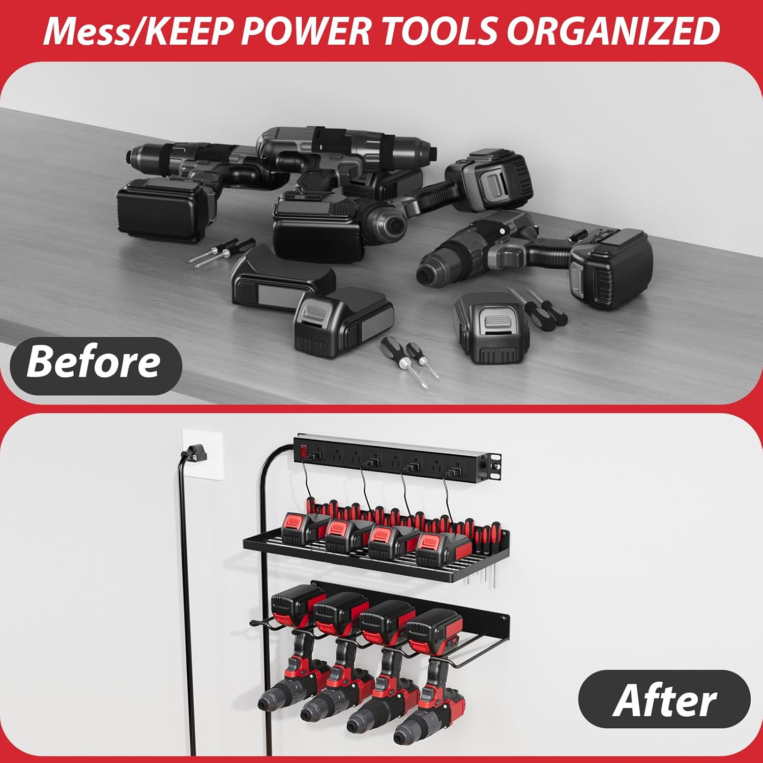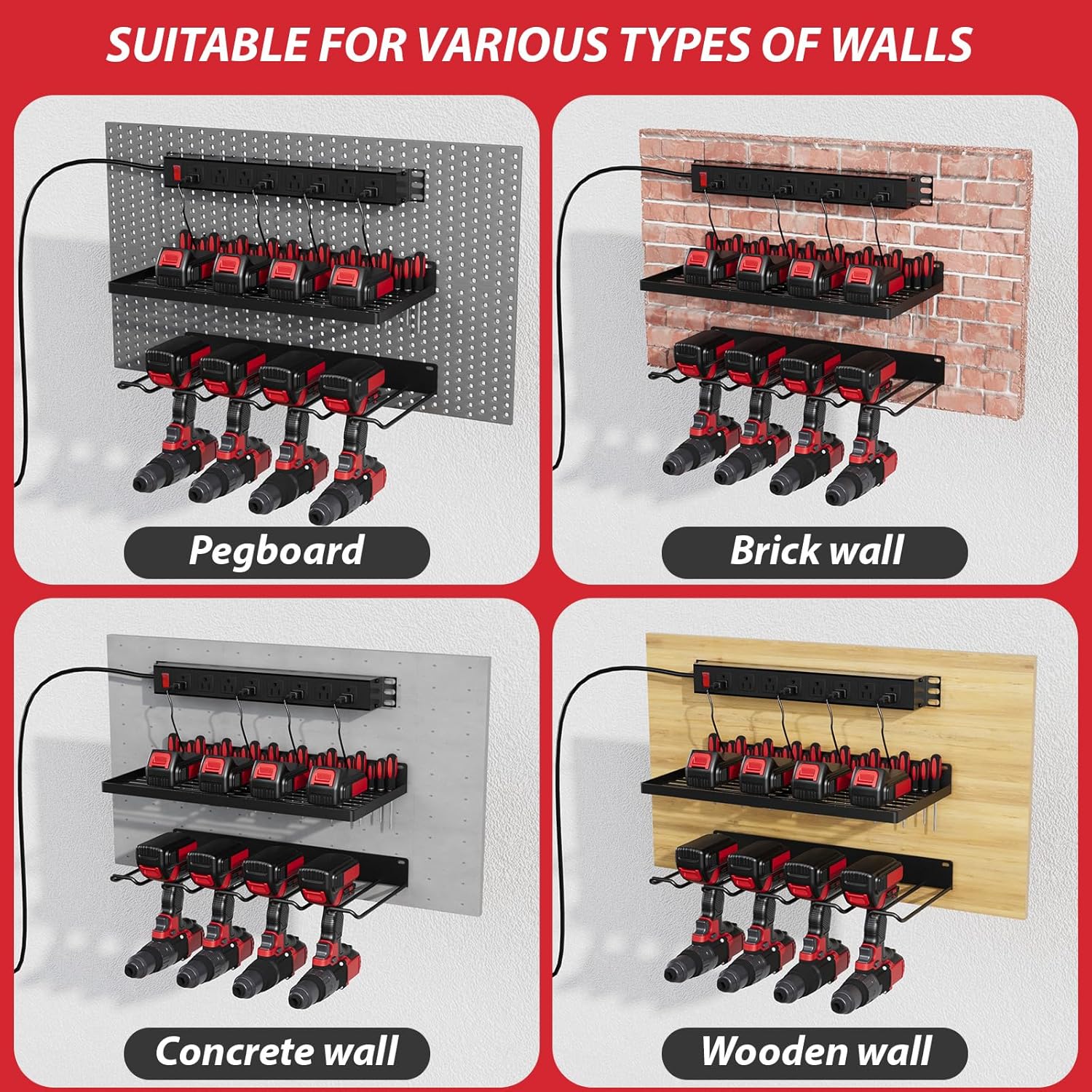 Power Tool Organizer With Charging Station, Wall Mount Drill Holder, Screwdriver and Battery Organizer, Heavy Duty Rack for Garage, Workshop, Tool Room, Workbench