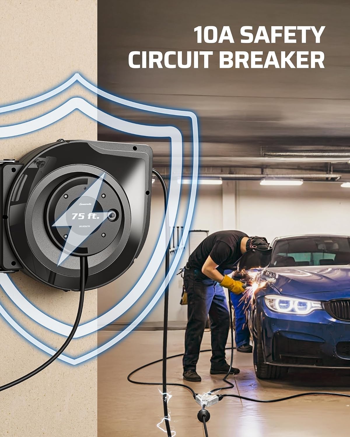 - [75FT & 14/3C & Three Outlets] This electric cord reel is rated for 15A/ 125V/ 1875W and features three outlets with a lighted indicator, making it perfect for hard-to-see areas; includes 50ft power cord and adjustable stopper for added convenience