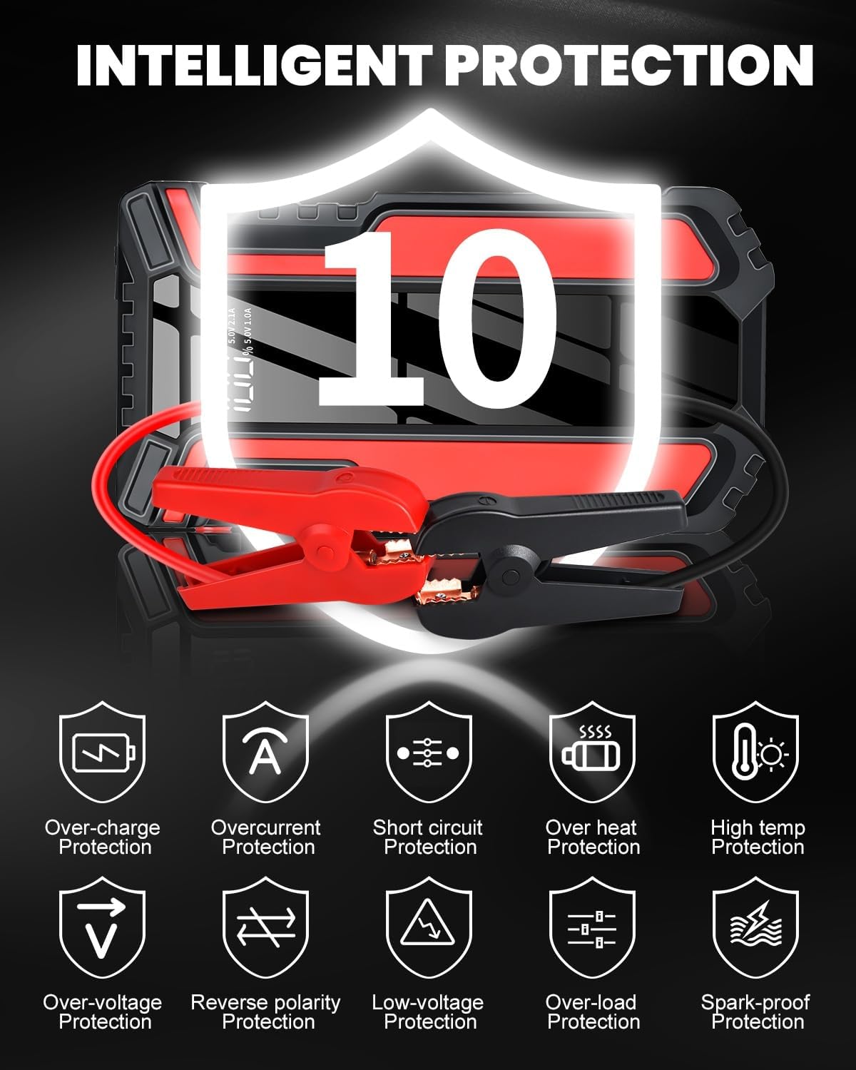 - ➤【COMPREHENSIVE SAFETY】The portable jump starter for car offer 10 layers of smart protection, including over-charge, overcurrent, short circuit, over heat, high-temperature, over-voltage, reverse polarity, low-voltage, over-load and spark-proof protection. Protecting you and your vehicle, make it more safe and easier for everyone to use.