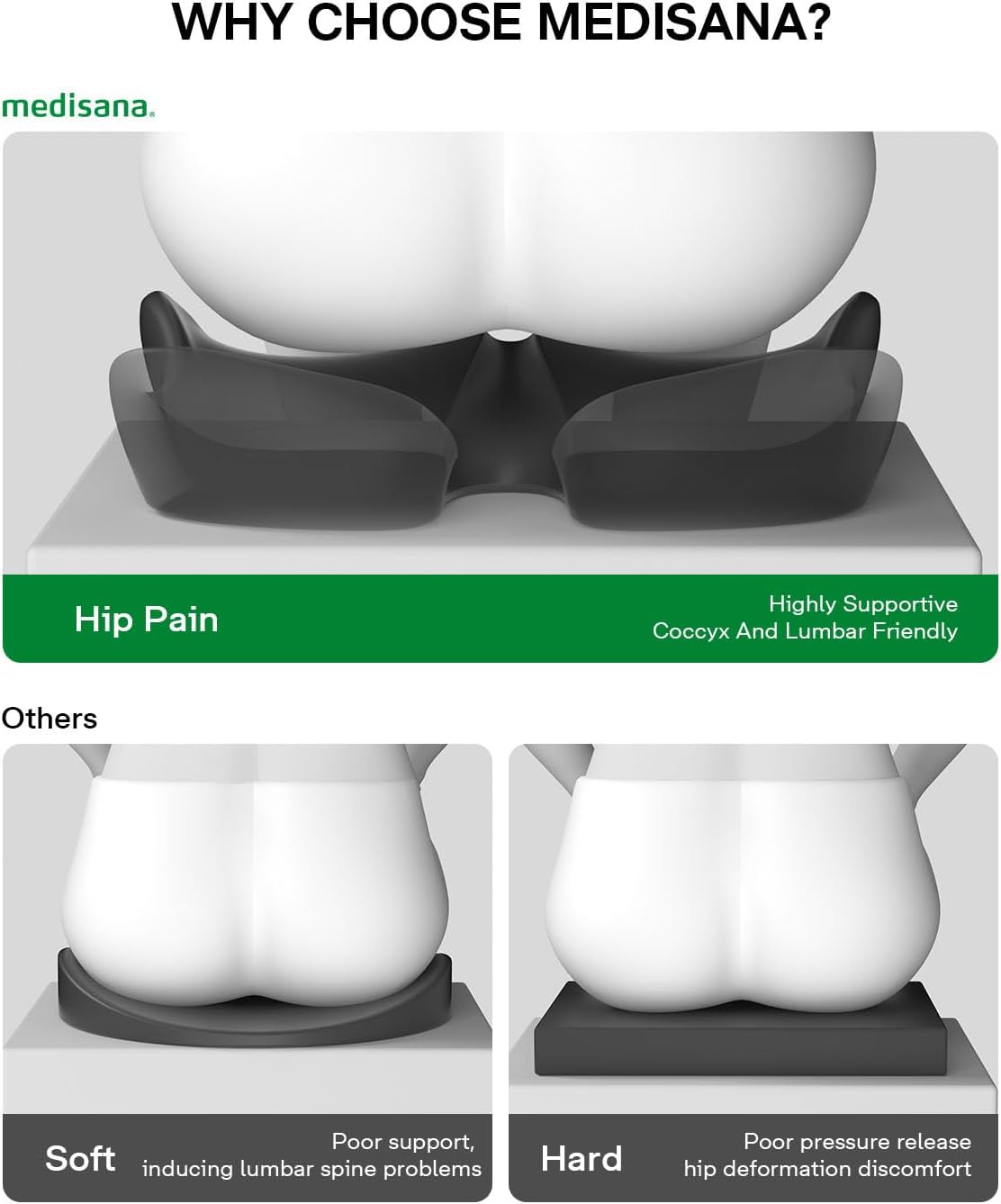- 【Ergonomic Chair Cushion】medisana seat cushion is based on ergonomics, the legs, buttocks, tailbone, physiological zone for scientific design of the six zones, targeted decompression of legs, tailbone, left and right buttocks, physiological zone, soothing spine protection.Helps to improve sitting posture and effectively relieve lower back pain and hip discomfort(Size:17 *14.6*3.54 in)