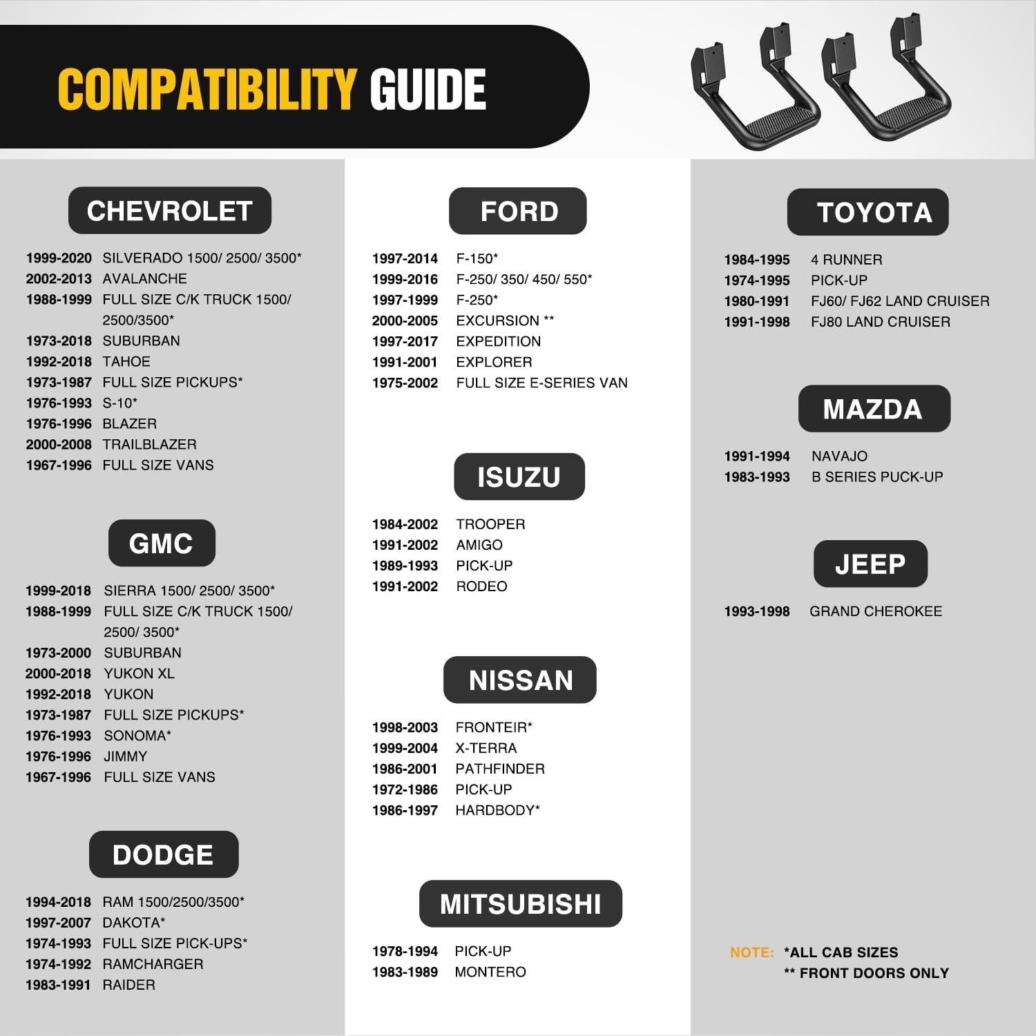 - 【VERSATILE FIT】- The universally-compatible Nilight Step offers both style and substance, elegantly enhancing accessibility for most trucks and SUVs, granting passengers an effortless lift into their cabins. Please check the pictures and make sure it fits your car before you buy it.