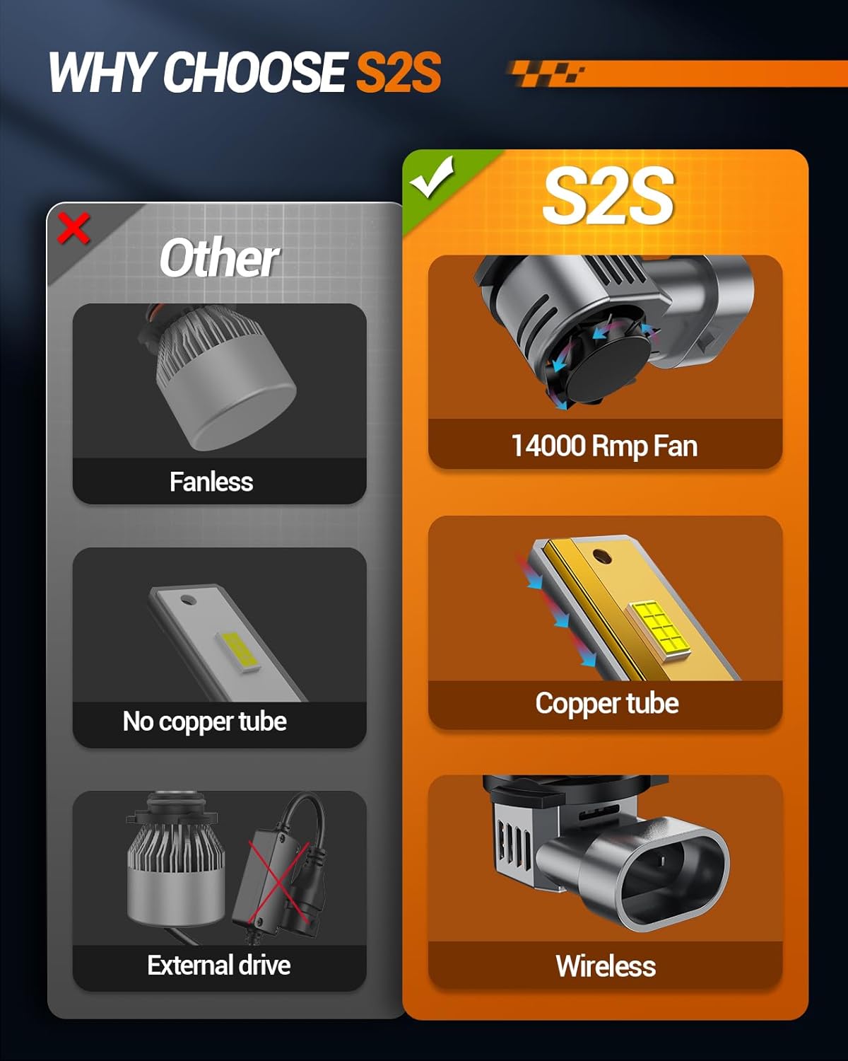 - Wide View And Safer: The S2S 9006/HB4 fog bulb is equipped with advanced smart IC drives with radiating distances of 1600F, 50000 lumens and 6500K cool white, ensuring a clearly visible driving experience at night. Made of high-speed cooling fans and single copper tubes, our bulbs keep low operating temperatures and provide reliable performance at night for longer life of over 60,000 hours