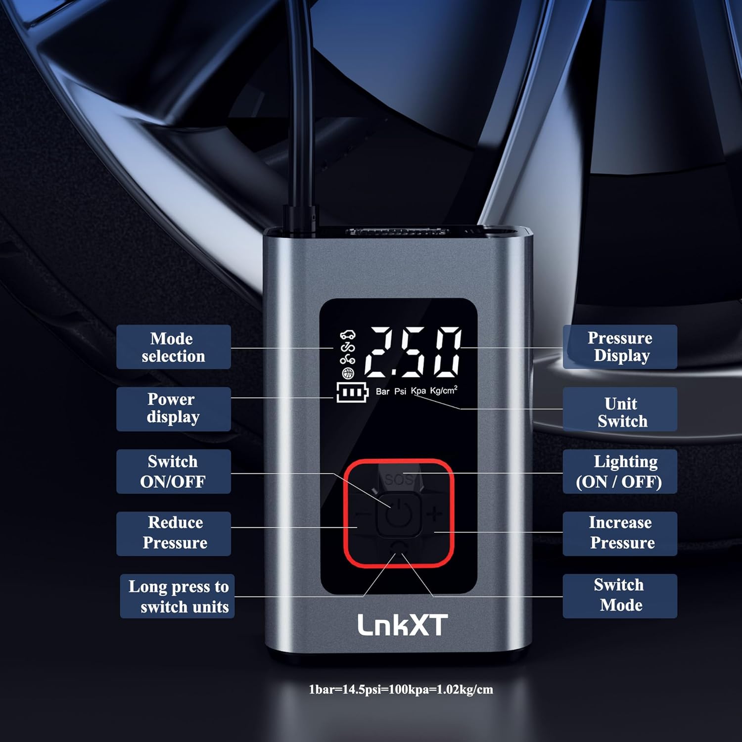 - Built-in LED Light with SOS Emergency Function – For added convenience and safety, this car tire pump includes a built-in LED light to illuminate your work area, especially useful during nighttime or low-light conditions. The LED also features an SOS flashing mode,with white light and red flash, providing a crucial safety feature in case of roadside emergencies or unexpected breakdowns. This dual functionality ensures you're well-prepared for any situation, day or night.