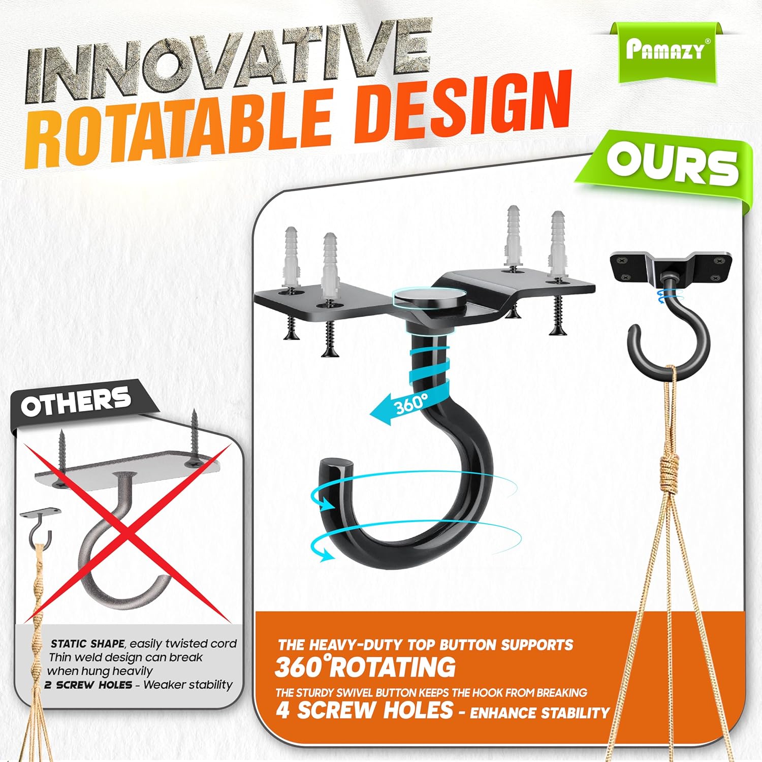 [UPGRADED] 2Pcs 200LBS Rotatable Ceiling Hooks with 4 Screw Points Base, Wall Mount Metal Hanger Black Ceiling Hook for Hanging Plant, Bird Feeder, Lights, Bed Canopy, Wind Chime, Indoor Outdoor Decor