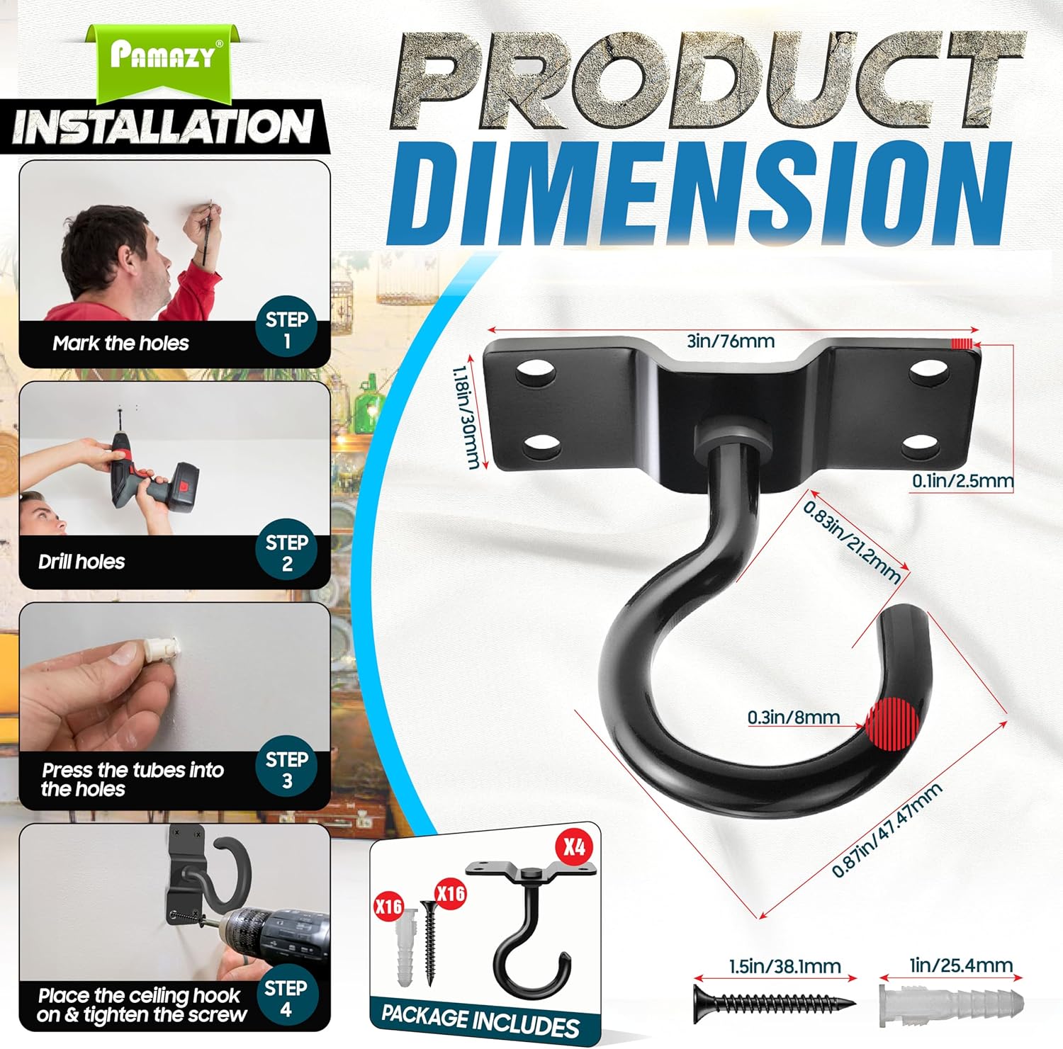 - [Easy To Install & Use] These ceiling hooks are simple to install; just drill holes in the wall, install expansion screws, and tighten the screws after installing the hooks. It can be assembled on the ceiling, brick, wood, and concrete walls, providing a perfect solution for hanging a range of items, including bird feeders, lanterns, plants, or decorations, making it a versatile accessory for any outdoor space. PACKAGE INCLUDES: 4 Ceiling hooks, 16 screws, and 16 expansion tubes.