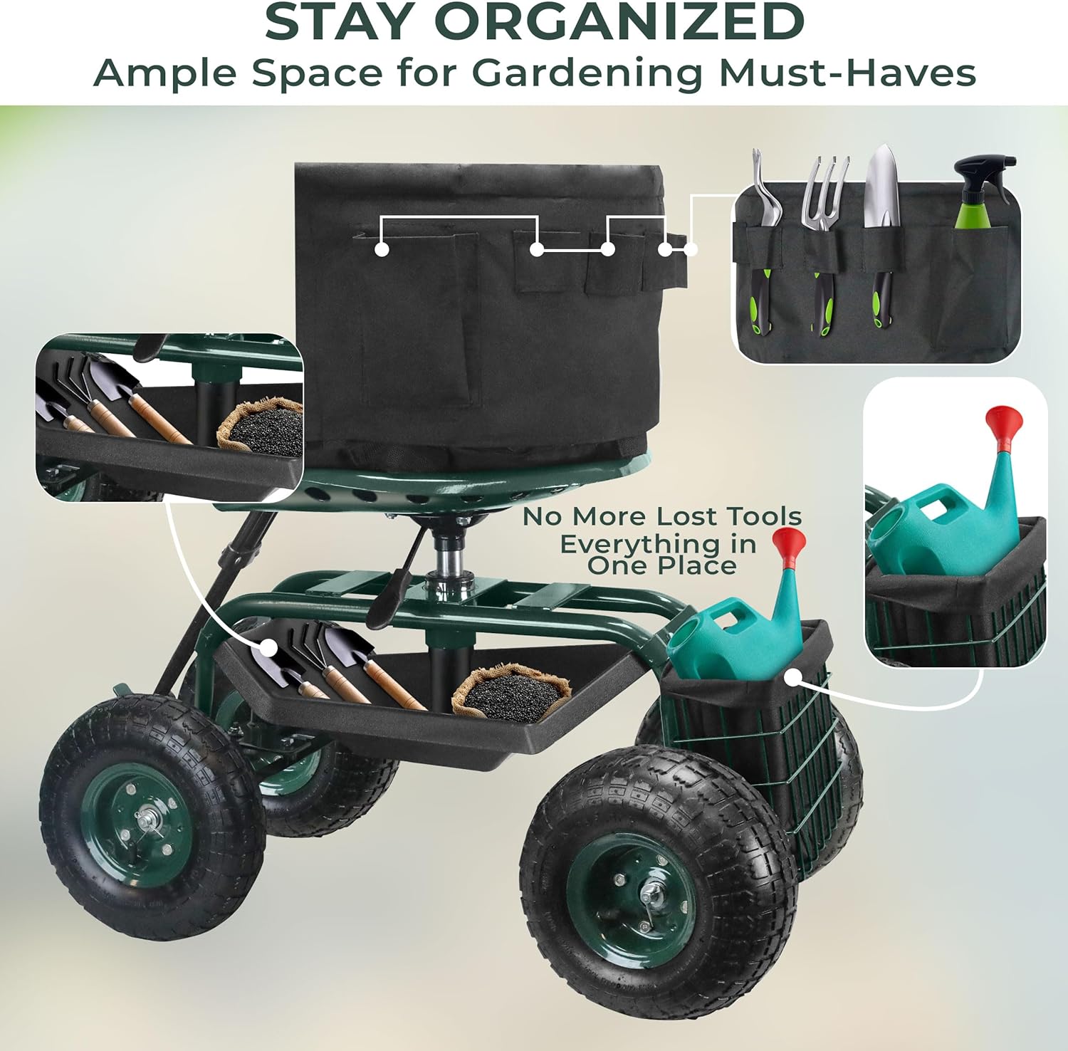 - Large Storage Capacity: Organize all your gardening tools with Luxe Function’s multiple storage options, including a spacious back basket, under-seat tray, and extra backrest pouch.