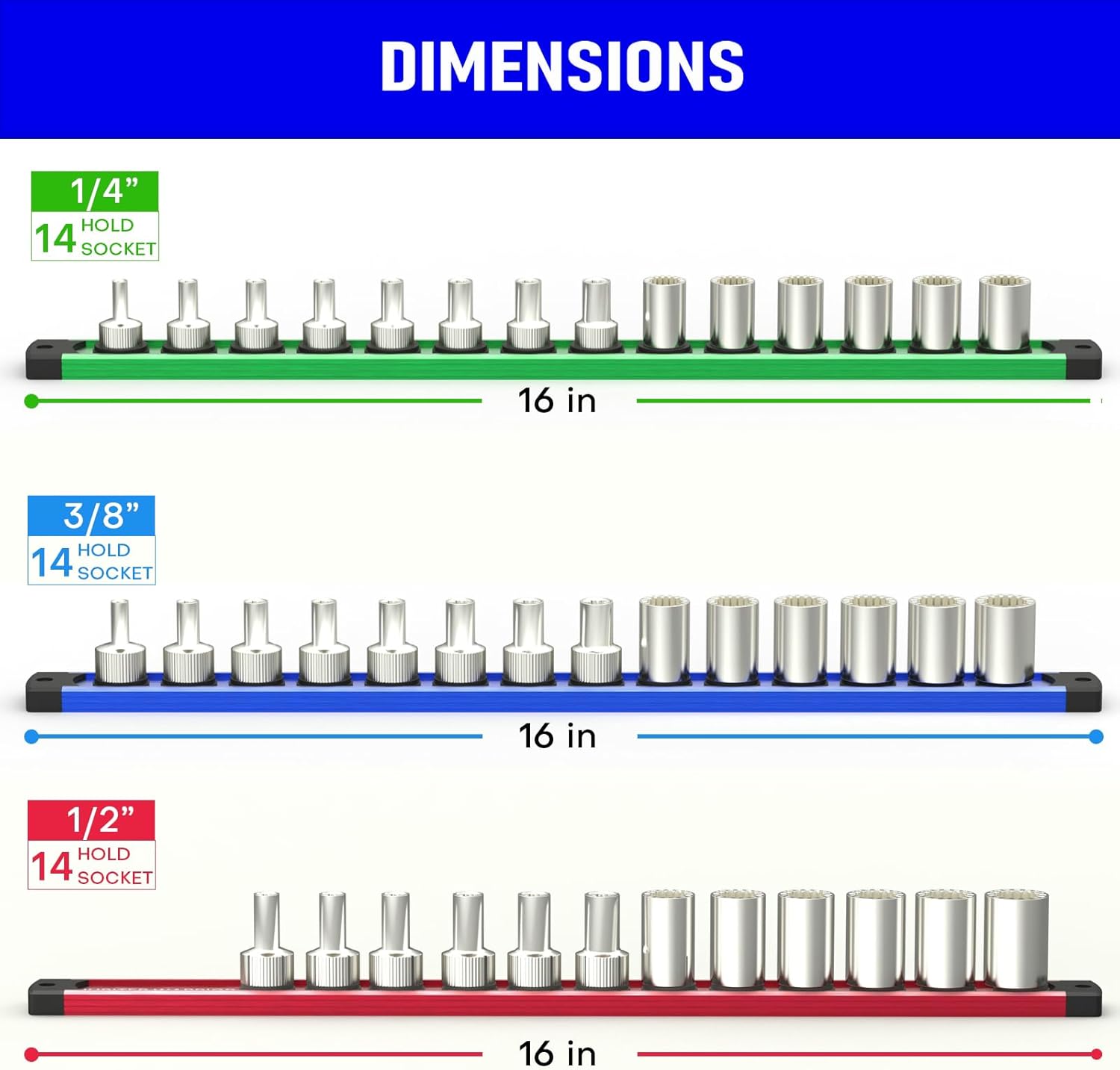 - 【Large Capacity Storage】Our magnetic socket rail set includes three aluminum socket organizers with 14 3/8” bearing clips, 12 1/2”, and 14 1/4” bearing clips, allowing you to neatly organize and access up to 40 sockets with ease. The round clips on the aluminum rail can twist 360 degrees on the groove, which will be convenient for access from any direction.
