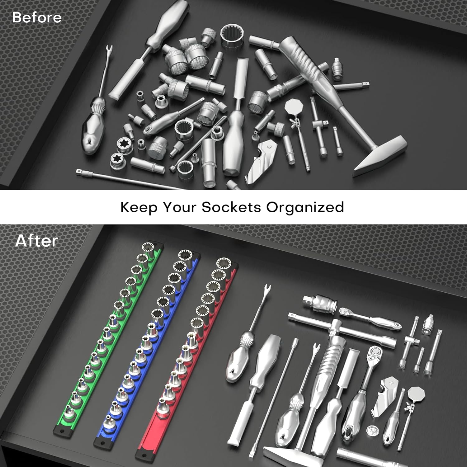 - 【Removable & Customizable】The end caps on both sides of the rail are screwed in place to prevent the clips from slipping. By simply unscrewing the ends, you can easily mix and match the different sizes of clips to create a socket organizer for tool box drawer that suits your unique needs.