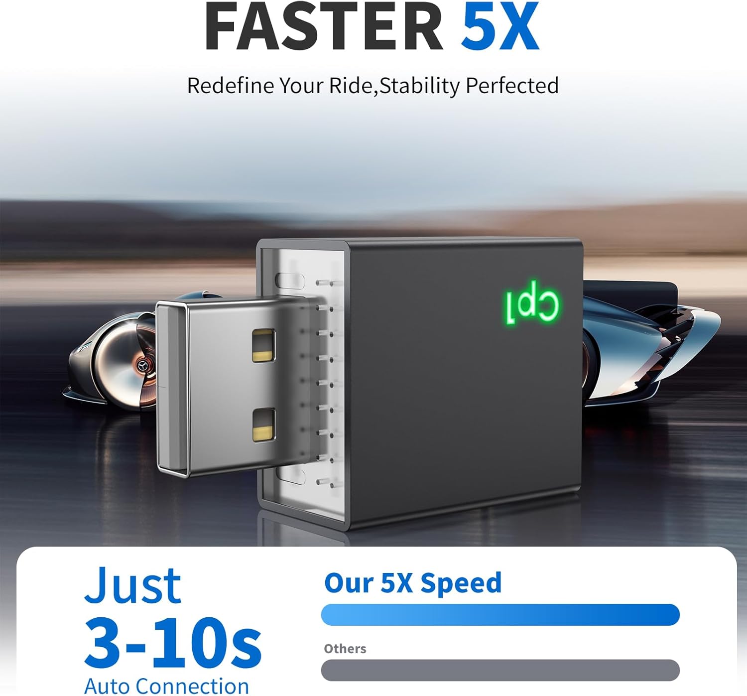 - 🔗 Stable & Ultra-Low Lag Connection:Unlike other apple carplay wireless adapter that suffer from disconnections or lag, our advanced 5.8GHz WiFi and Bluetooth 5.X ensure ultra-fast response times. Less than 1 second delay for music, navigation or calls, which even on bumpy roads, the connection stays rock-solid, keeping your drive smooth.