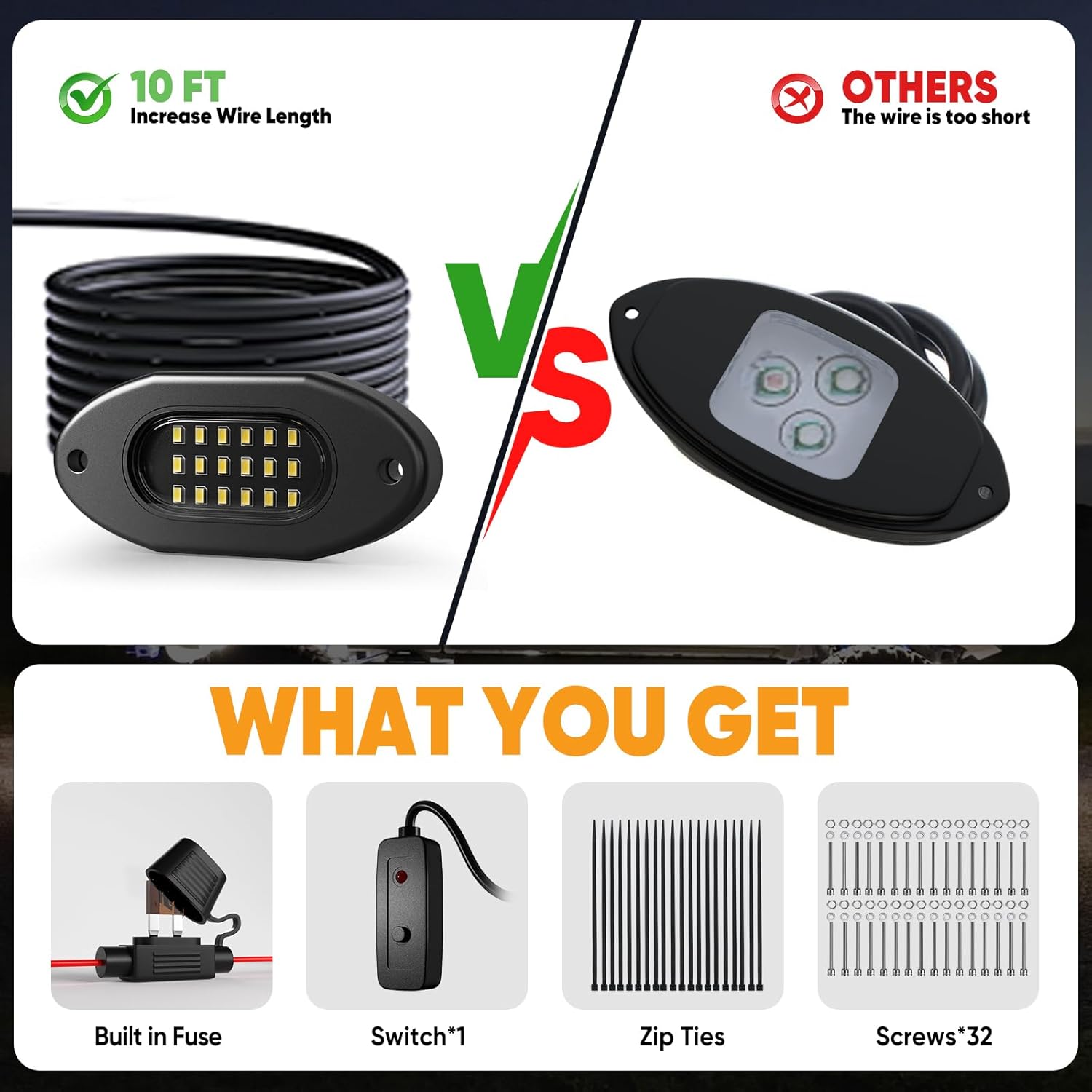 - Included Components : Rock Light Kits, Switch, Blade Fuse, Zip Ties, Screws, Allen Wrench