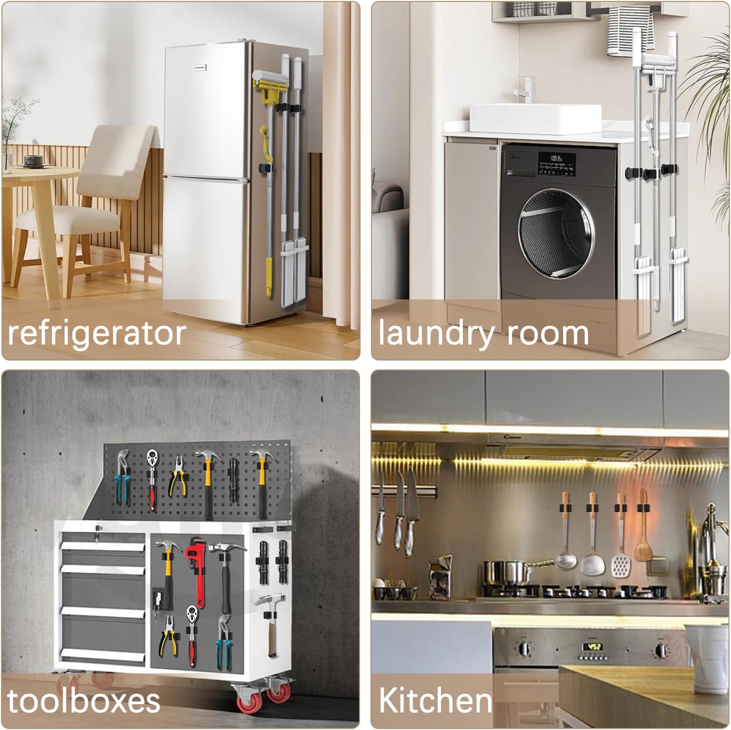 - [PREMIUM QUALITY] It comes with 4 strong magnetic broom hanger and 4 magnetic hooks.For the broom holder wall mount with Anti-Rust stainless steel and the grip of the abrasion-resistant silicone grip keeps broom and dustpan,tools,shovels very well, mop and broom holder wall mount won't fall off easily last for years,for the magnetic hooks you can easily stick to the surface of refrigerator, iron door, iron filing cabinet